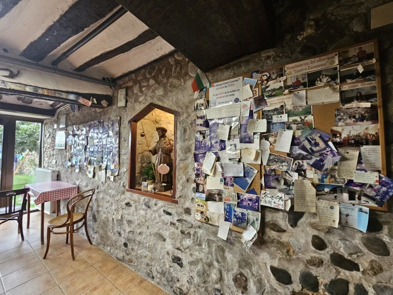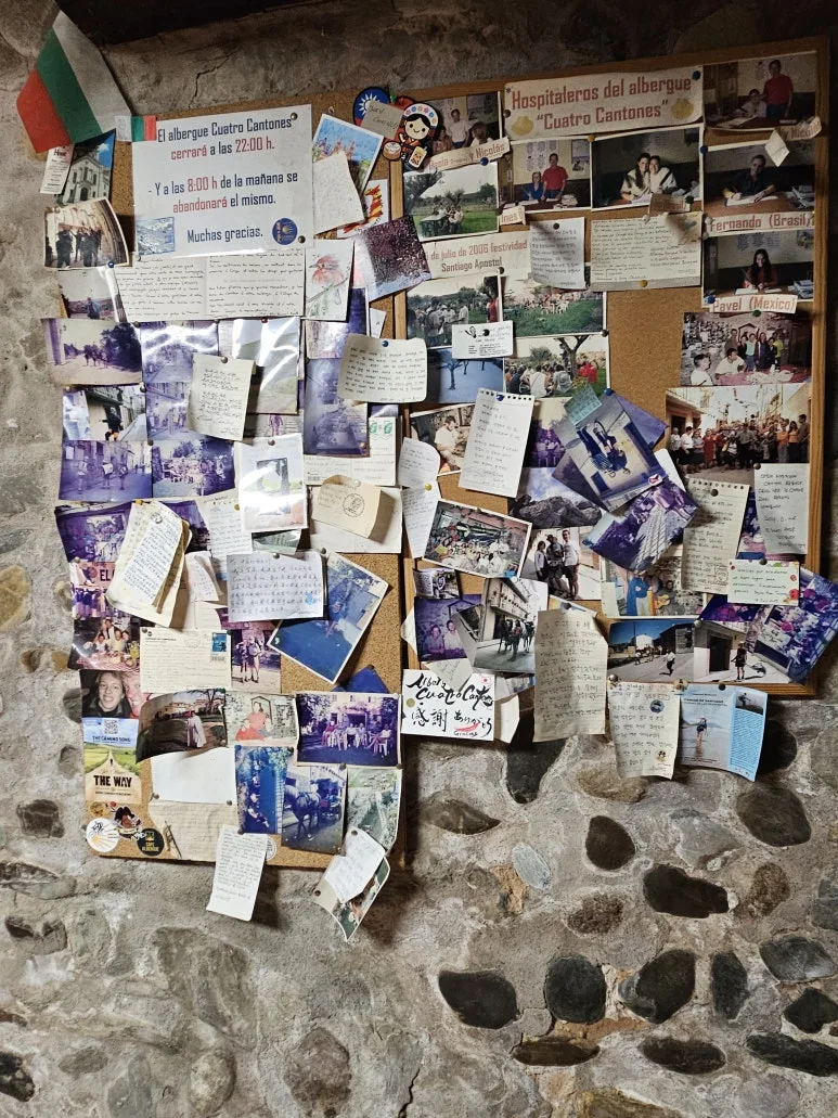 새벽에 0층 화장실을 세 번 드나들며 5시에 방에서 아예 나왔다. 2층 화장실을 이용하면 사람들 깰까봐 화장실도 돌아가는 길을 택했다. 0층에 내려와 벽에 붙은 편지를 다시 읽었다. 이 길을 걷는 이들 중 가족 잃은 슬픔이 묻어 있었다. 길은 땅에 발을 디딜 때마다 스틱으로 '톡' '톡' 누른 것처럼 장면 장면이 튀어 올랐다. 길 자체의 본질인데, 한국에서는 스마트폰에 눈을 뺏기고 블루투스에 귀를 뺏기고 다가올 미래에 마음을 빼앗긴다. 영화 같은 장면도 저장되어 있는데. 길 자체를 보는 것이 삶 자체를 훑어보게 했다. 세상을 ‘있는 그대로' 보라는 듯이.
