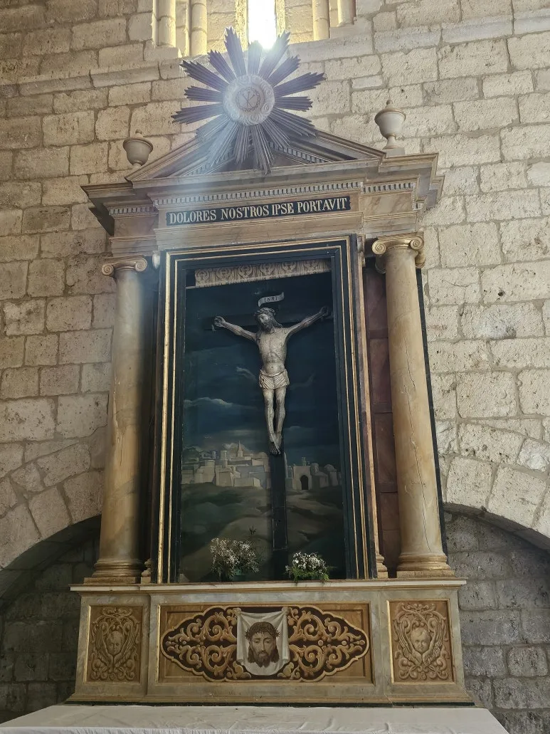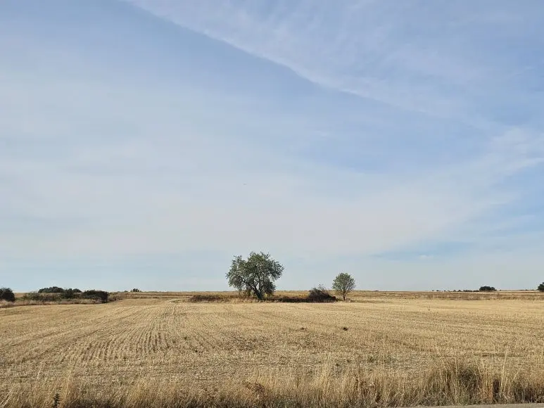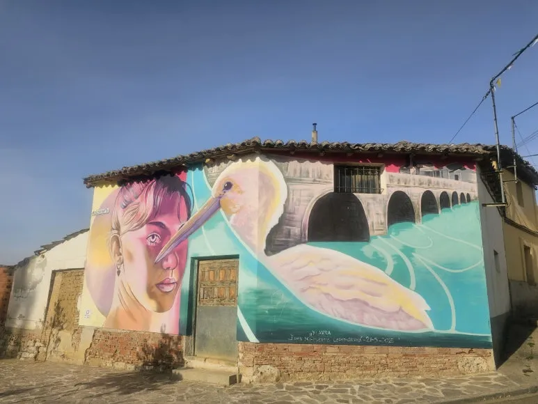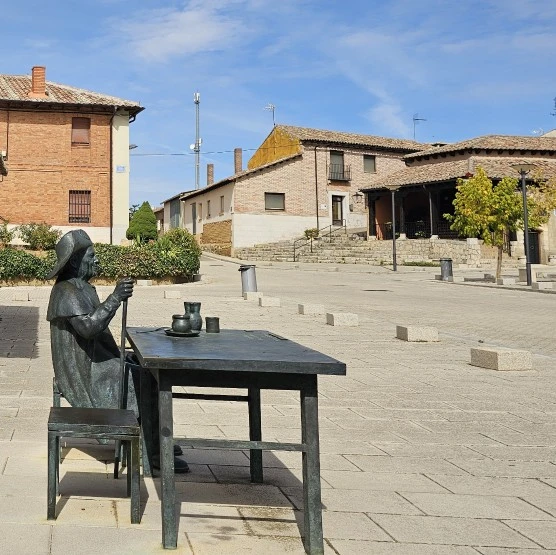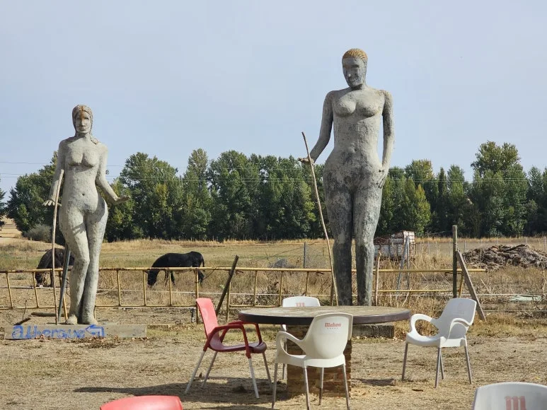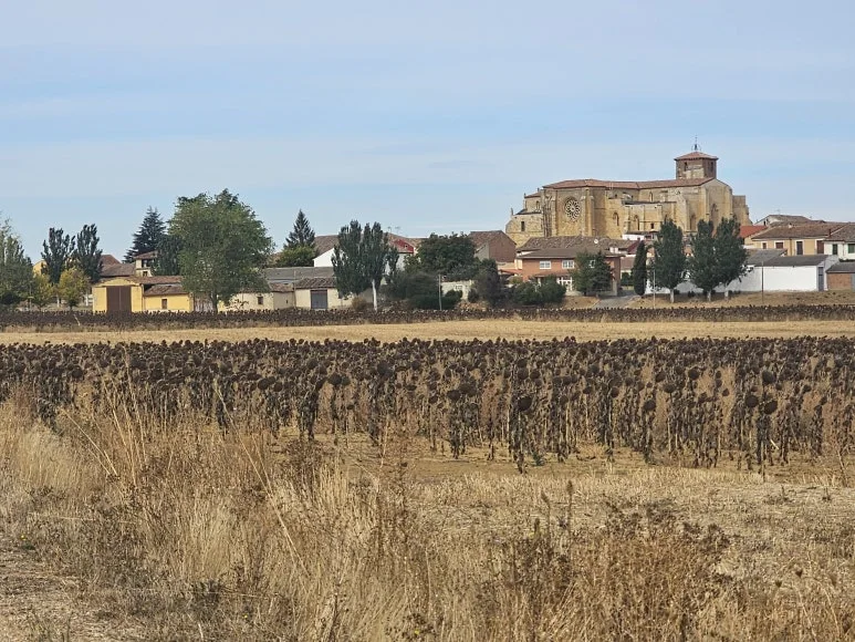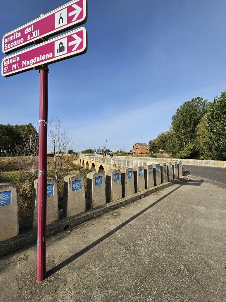 치킨 맛집으로 유명한 바에 또 들렀다(비야르멘테로 데 캄포스, Villarmentero de Campos). 이전 바는 화장실이 목적이었고 지금은 치킨이 목적이니, 내 몸의 ‘위장’ 폴더도 아까와는 다르게 저장할 것이다. 7유로에 환상적인 맛의 치킨과 감자, 맥주가 기다리고 있었다. 좀 전의 바에서는 '작품'이 덤이었다면, 이곳은 '가성비'가 덤이었다. 덤으로 사는 게 인생이다. 예상치 못한 삶의 이득을 '덤'이라 느낄 테니까. 치킨 맛집의 야외 테이블은 그 자체로 근사했는데, 웅장한 ‘산 마르틴 성당’이 병풍처럼 든든히 뒤를 받쳐주고 있었다. 성당의 고풍스러운 석조 아치는 아기자기한 마을에 묵직한 힘을 보탰다. 배부르고 등 따스운 기운에 가성비 넘치는 음식까지 더해지니, 1유로 세요(Sello)도 거침없이 냈다. 시골길에도 간간이 마주치던 순례자 동상이 이 마을에도 작품처럼 나를 기다리고 있었다.