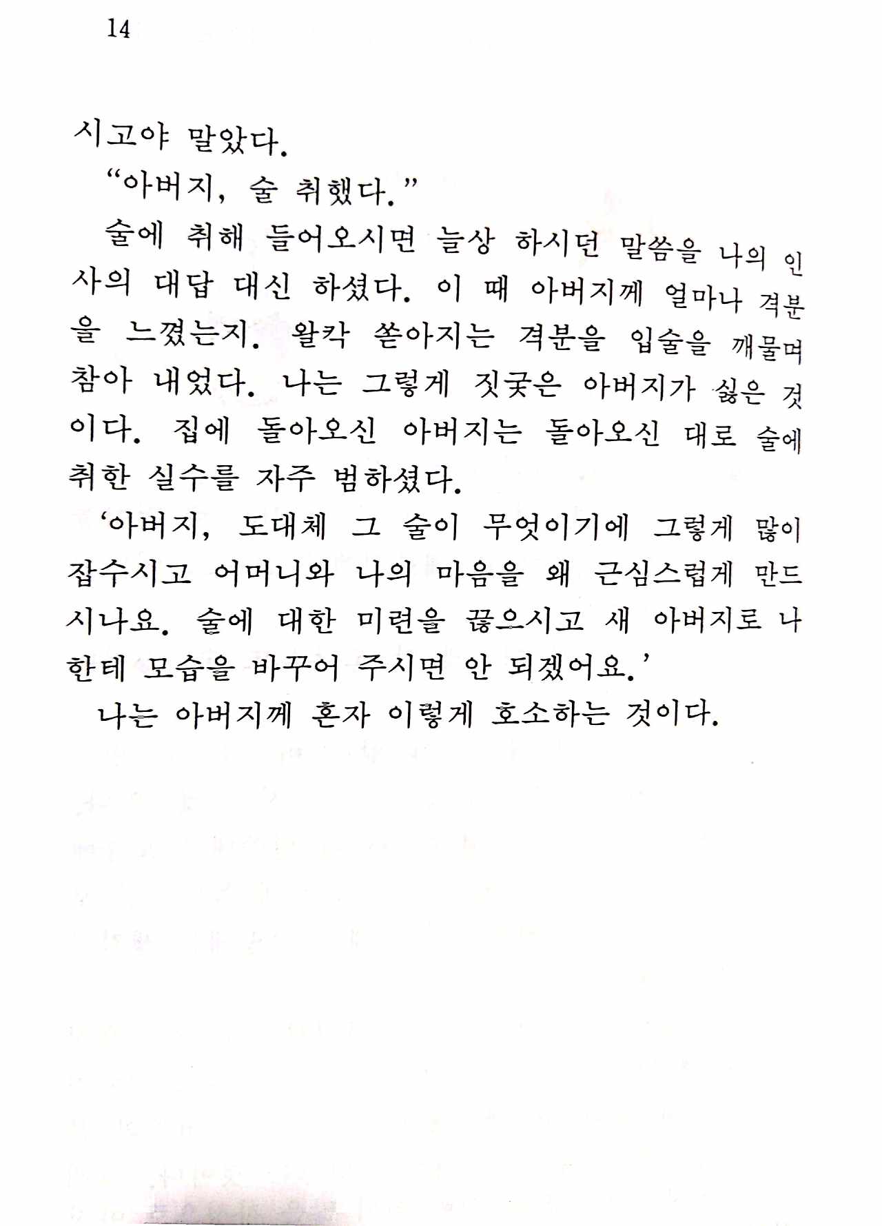 '아버지, 도대체 그 술이 무엇이기에 그렇게 많이 잡수시고 어머니와 나의 마음을 왜 근심스럽게 만드시나요. 술에 대한 미련을 끊으시고 새 아버지로 나한테 모습을 바꾸어 주시면 안 되겠어요.;