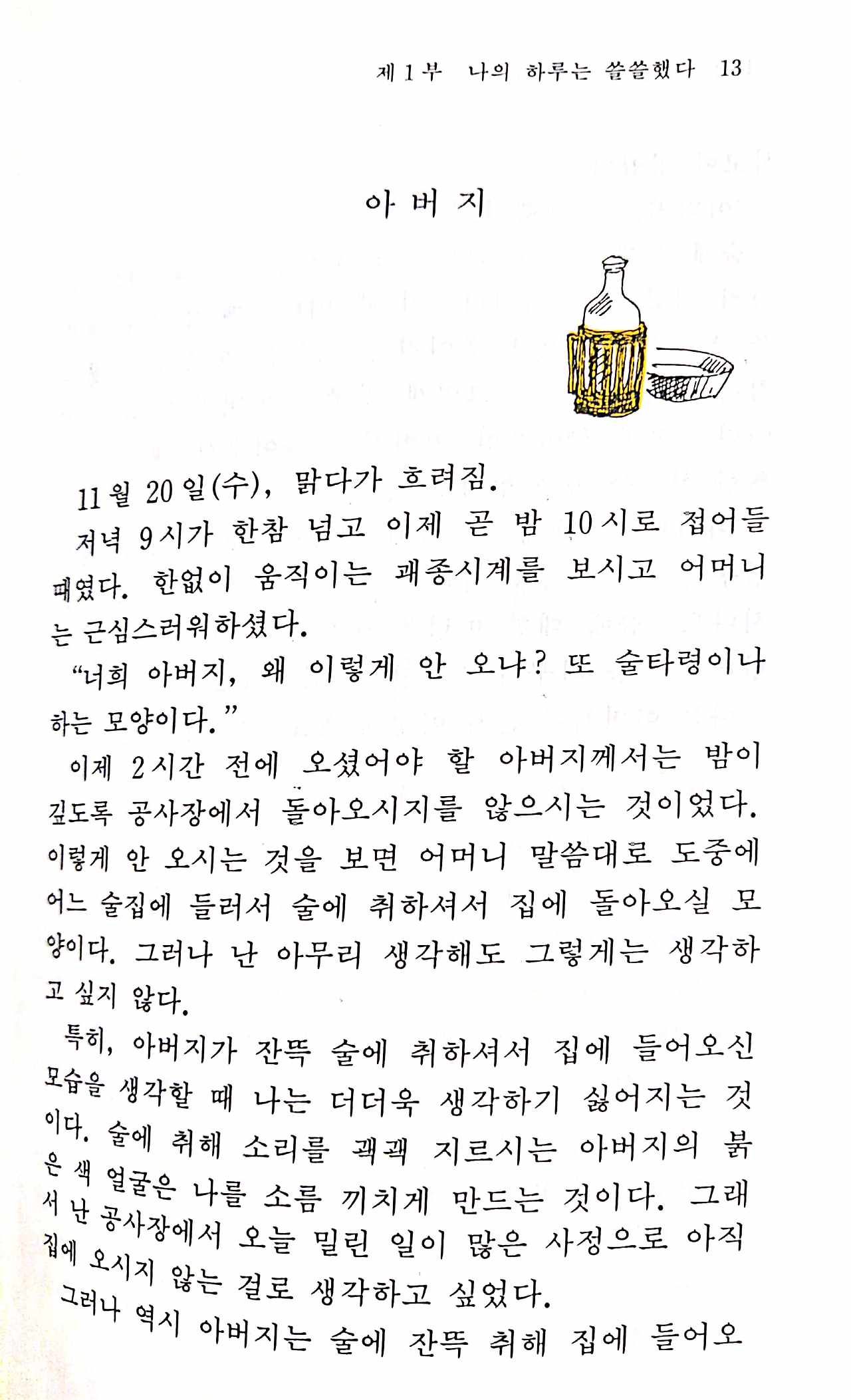 이제 2시간 전에 오셨어야 할 아버지께서는 밤이 깊도록 공사장에서 돌아오시지를 않으시는 것이었다. 이렇게 안 오시는 것을 보면 어머니 말씀대로 도중에 어느 술집에 들러서 술에 취하셔서 집에 돌아오실 모양이다. 그러나 난 아무리 생각해도 그렇게는 생각하고 싶지 않다.