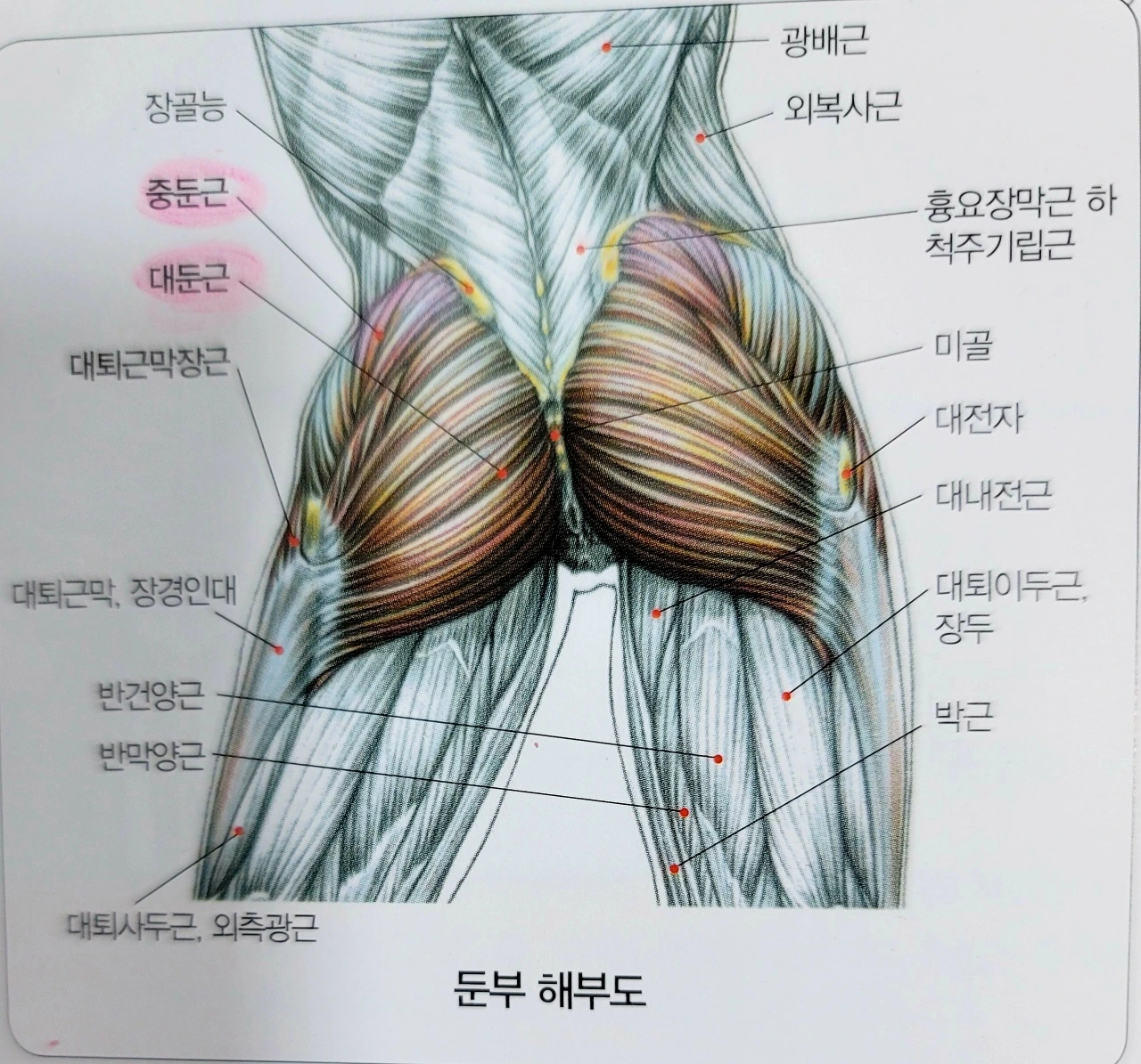 엉덩이 근육은 대둔근, 중둔근, 소둔근으로 이루어진다. 가장 큰 땅덩어리인 대둔근과 라인을 담당하는 중둔근을 다룬다. 대둔근은 다리를 뒤로 뻗고 가져올 때, 중둔근은 다리를 옆으로 뻗고 가져올 때 자극된다. 대둔근 운동은 쳐진 엉덩이를 위로 올려 다리가 길어 보이는 효과, 중둔근 운동은 힙선 정리와 허리 라인이 가늘어 보이는 효과가 있다.
