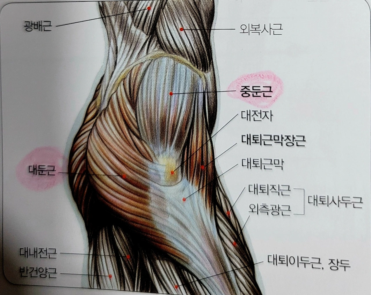휘트니스센터에 가면 힙 어브덕션(hip abductions) 기구가 있다. 집에서는 의자에 앉아 허벅지에 밴드 끼고 두 다리를 바깥 쪽으로 밀고 서서히 돌아오면 된다. 영상을 찍은 이유는 상체를 앞으로 숙일수록 대둔근이, 상체를 뒤로 기댈수록 중둔근이 자극된다는 점을 설명하기 위함이다.