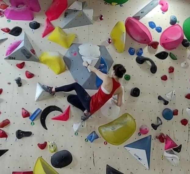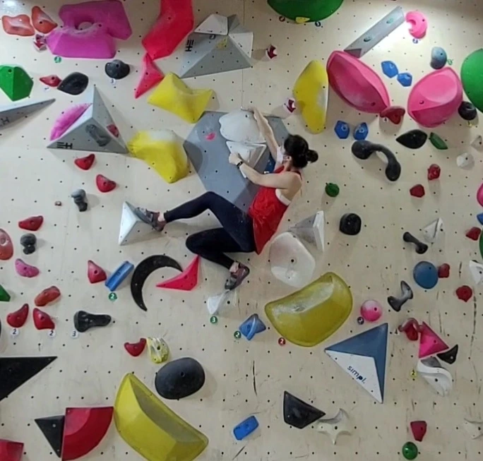 클라이밍은 실내암벽이라고도 불린다. 벽에는 ‘홀드’라는 돌이 박혀 있다. 크기와 모양으로 난도가 판가름 난다. 손가락으로 가뿐히 잡게끔 홈이 파인 것, 손가락과 맞장뜨는 평평한 것, 욕 나올 정도로 얇고 작은 것 등 보기에만 예쁜, 알록달록 벽이 된다. 홀드를 가리키는 라벨 색깔로 레벨을 구분한다. 지구력을 키울 땐 많은 홀드를 잡는다. 볼더링이라는 순발력을 요하는 벽면도 따로 있다. 경사진 벽은 코어와 하체, 등근육, 손가락 힘이 협동해야 한다. 숨도 차고 버텨야 하고 고소공포증도 몰려오는 이 운동에 걸려 들다니.