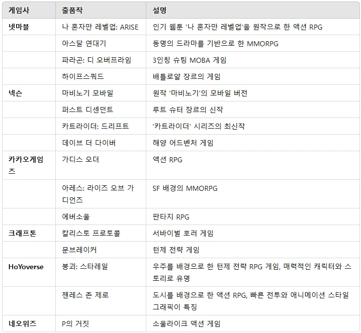 현장에 방문하였을 때 기억으로 가장 많은 인원이 몰렸던 부스들만 추려서 살펴보도록 하겠습니다. 크게는 이렇게 보이는데 아직 출시되지 못한 게임들도 있고 정말 흥행하여 인기를 끌었던 게임도 있습니다.