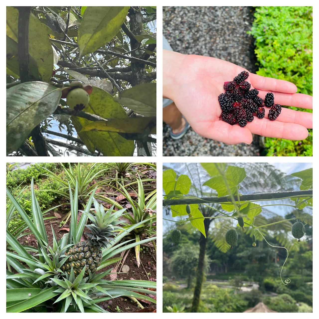 친절한 투어 가이드를 만나서 정원 곳곳을 돌며 식물들 하나하나에 대한 설명을 들었다. 아이는 처음에는 시큰둥하더니 투어 중간중간 과일들 따보고 맛보기를 하면서 관심도가 급상승했다. 그래, 그렇지! 보는 것보다 만지는 거, 먹는 것이 더 큰 교육이지. 여러 종류의 베리류도 맛보고 모양은 다르지만 한국 오이맛 나는 채소도 맛보고, 너무나 잘 아는 파인애플도 바로 따서 먹어보는 체험이라니. 기대 이상으로 알찼다. 커다란 나무들에 두리안과 망고스틴, 오렌지, 그리고 이름 어려움 과일들이 매달려 있어서 정원은 달콤한 향기로 가득 차 있었다.
