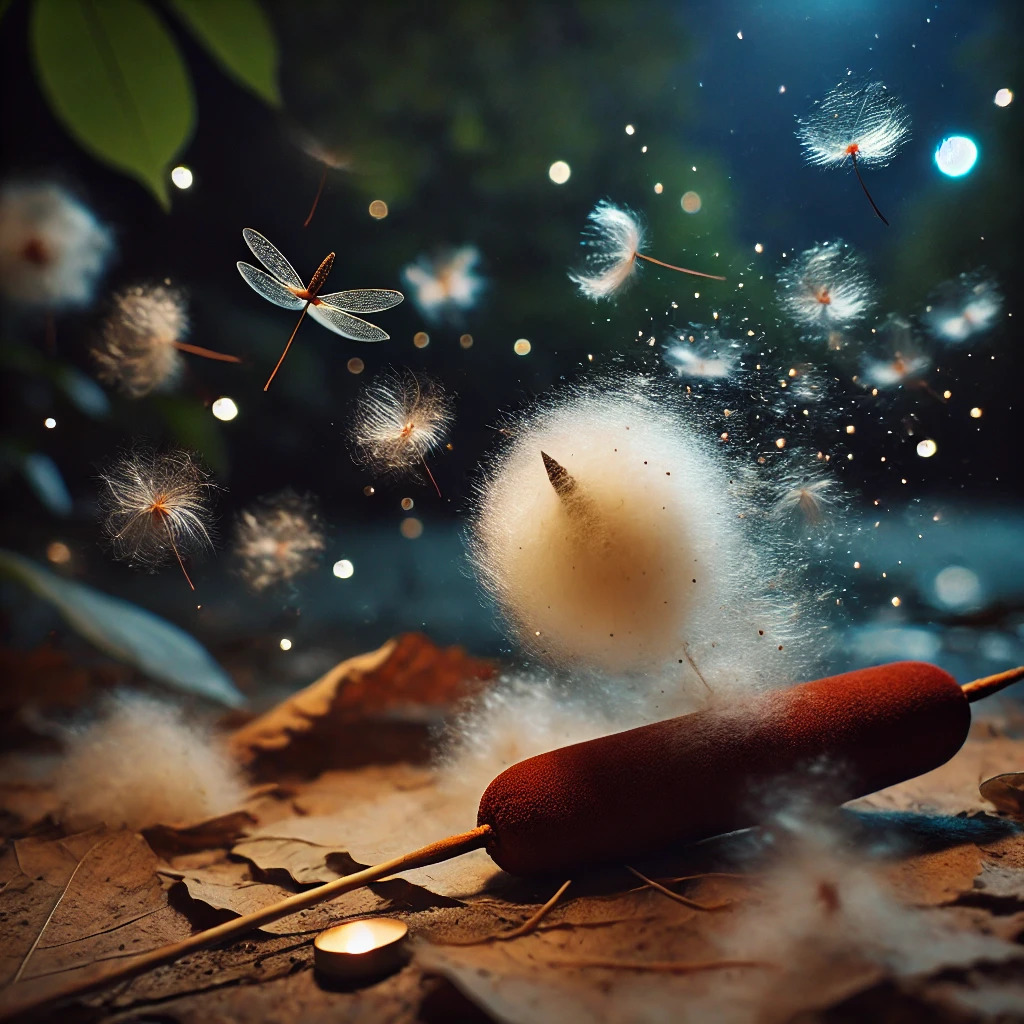 이야기를 채 끝내지 못하고 반딧불이 번데기는 잠이 들었어요. 그 옆에서 애기부들은 부르르 떨고 있었어요. 바람이 다시 애기부들을 태우고 하늘로 떠올랐어요.