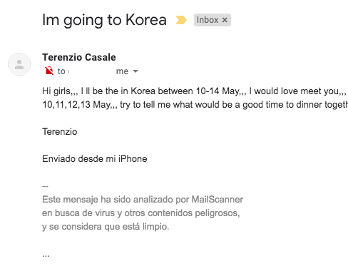 2016년, 한국에서 취업하며 살아가던 해에 테렌지오가 직접 한국에 왔다. 2년 전에 미국 애틀랜타에서 만난 아저씨를 태평양 건넌 지구 반대편에서 만나게 된 것이다! 그 해에 열린 푸드쇼에 직접 참여하기 위해 온 거였다. 이메일을 받았을 때의 반가움이란.광화문에서 만나 코리안 바비큐(삼겹살) 도 먹고 오래간만에 만난 테렌지오와 그의 직장 동료와 함께 얼마나 지구가 작은지, 우리 인연이 얼마나 대단한지에 대해서 이야기했다. 아직도 내가 좋아하는 냉동 블루베리, 칠레에서 온 청포도를 먹을 때마다 테렌지오가 생각난다. 인연에는 끝이 없다.