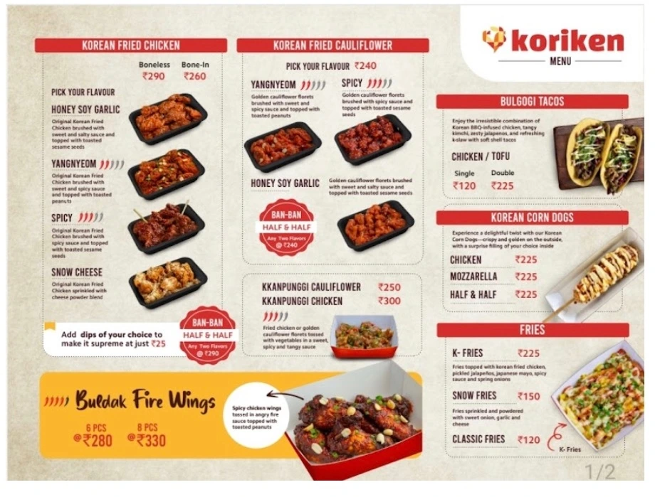 방갈로르의 'Koriken'이 대표적인 사례입니다. 2022년 인도인 창업자 하산 파텔(Hasan Patel)이 설립한 이 한식 전문 QSR(Quick Service Restaurant) 체인은 서울 길거리 음식을 인도화하는 데 성공했습니다. 한국식 프라이드 치킨, 라면, 만두 등을 제공하면서도 인도 젊은 세대의 입맛에 맞게 메뉴를 조정했죠. 채식 인구가 많은 인도의 식문화를 반영해 채식(Veg)과 비채식(Non-veg) 옵션을 명확히 구분하고, 매운맛 수위도 현지 선호도에 맞췄습니다.