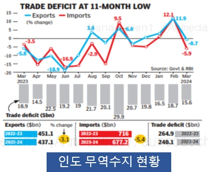 사실 인도 무역 수지는 아직 적자에 머무르고 있습니다. 그러나 작년과 올해 여러 가지 글로벌 이슈에도 준수한 수준을 이어가고 있고, 23-24년 회계연도에는 무역 적자 폭이 최저 수준으로 줄어드는 등 인도 정부는 긍정적으로 분석하고 있습니다.