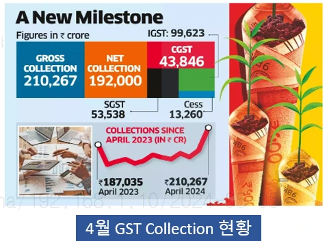 인도의 GST(상품 및 서비스세)의 4월 수집액이 사상 최고치인 ₹2.10조를 기록했습니다. 이는 강력한 국내 거래 증가 (13.4% 상승)와 수입 증가 (8.3% 상승)에 의해 주도되었고 전년 동기 대비 12.4% 성장하였습니다. GST 수집액이 2조 루피를 처음으로 돌파한 것은 견조한 경제 성장과 세금 징수의 행정 효율성을 반영하는 것입니다.