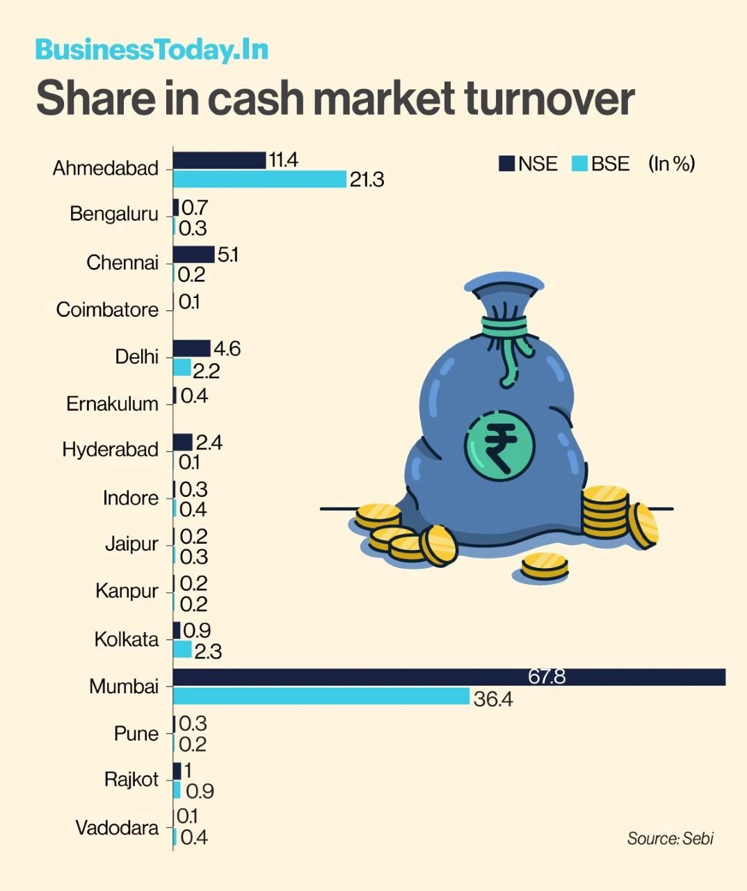 최근 인도 경제지 Business Today는 인도 증권거래소별 각 도시의 증권거래액 기여도를 발표한 자료를 배포했는데, 뭄바이는 FY23년 BSE의 거래액 중 68%를 차지하며 압도적인 1위를 가져갔다. 2위는 아메다바드로 11%를 차지했다. 두 도시가 전체의 80%를