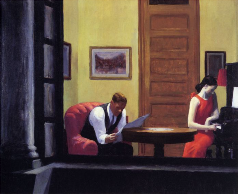 현대인의 절대 고독을 잘 보여주는 그림이 호퍼의 작품 ‘뉴욕의 방’(Room in New york)이다. 집 안 거실에 부부가 앉아 있다. 남편은 신문을 읽고 있고, 부인은 피아노 앞에 앉아 있다. 부인은 피아노를 연주하기 보다 그냥 건반 하나를 툭 건드리는 것 같다. 피아노에 딱히 관심이 있어 보이지 않는다. 두 사람 사이의 공기는 탁하다. 두 사람 사이에 그려진 문 그리고 둥근 탁자가 그 둘 사이에 가로막힌 감정적 장벽처럼 보인다. 그림 좌편과 그림 아래쪽에 드리운 어두운 색깔이 이 부부의 마음 상태를 대변해준다. 이들은 대화의 부재 상태, 즉 각자가 고독한 상태로 느껴진다.