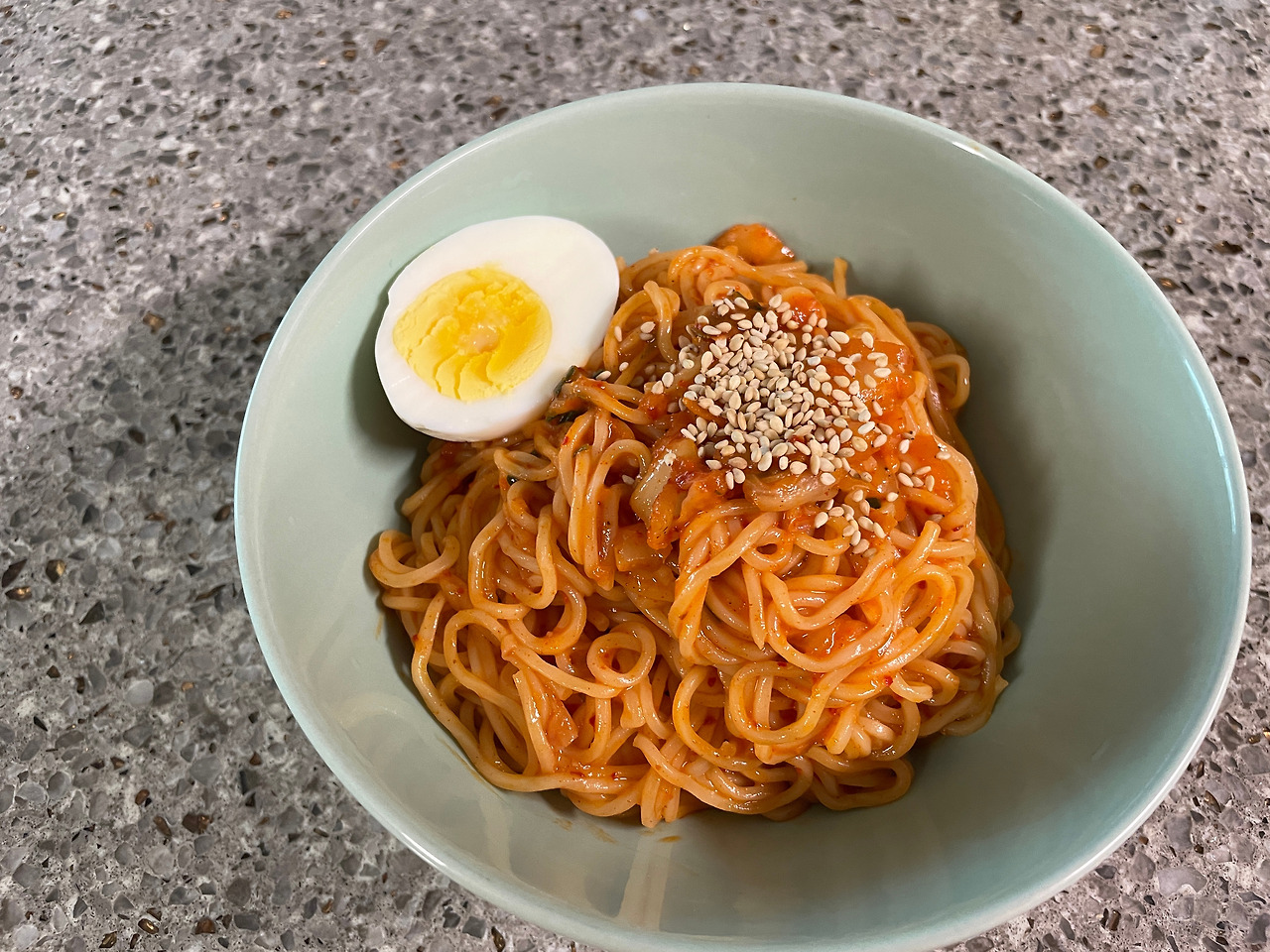 시간이 많아졌다. 뭐라도 해 먹어 볼까 하는 마음이 다시 들 정도로. 약 한 달 전 업무 관계로 받은 생면 제품들이 있었다. 어제는 메밀생면으로 들기름 막국수를 해 먹었는데, 뒷정리를 하면서 냉장고를 다시 보니 소면도 있었다. 유통기한이 얼마 남지 않아, 빨리 뭐라도 해 먹어야 했다. 뜨겁게 먹기는 덥고, 차가운 육수는 만들기 어렵고. 근데 매운 건 먹고 싶고. 그렇게 냉장고에서 '보물'이 되기 전에 구해야겠다는 생각으로 만든 주말의 점심 메뉴. 비빔국수였다.
