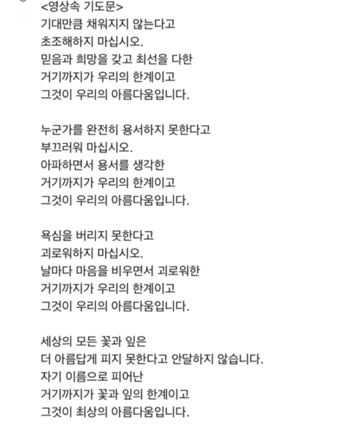 지난주에 본, 어느 기도회 설교 영상에서 목사님이 하신 질문이다. 청중들에게 한 질문이 아닌, 과거를 회상하면서 자신에게 한 질문이었다. 남을 위해 했던 말을 나 자신에게도 해줘야 했다면서, 스스로를 아껴줘야 했다면서 남긴 질문. 나도 그 질문들을 다이어리에 옮겨 적었다.