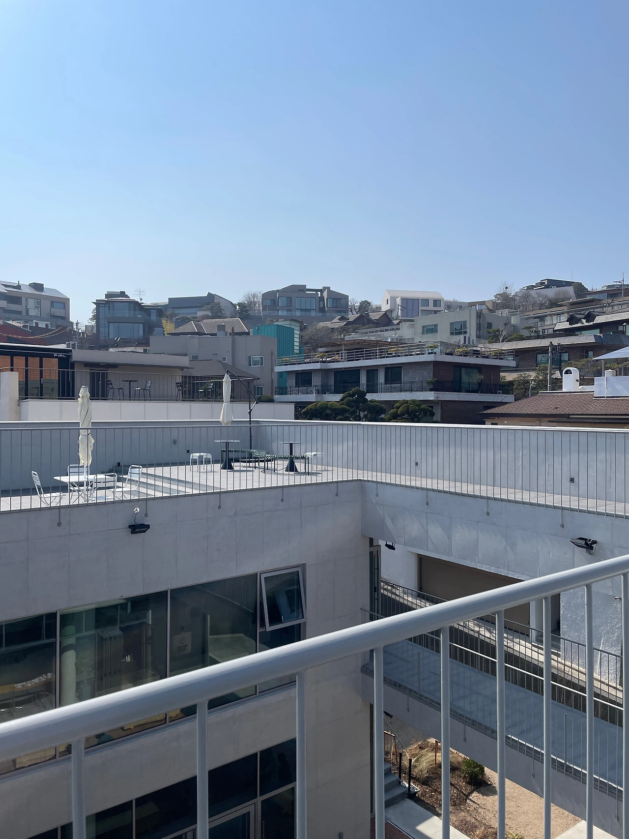 티타임의 막바지, 바깥쪽을 보던 언니가 대뜸 말했다. 외국인 두 명이 2층부터 나 있는 계단을 통해 옥상에 올라가는 모습이 보였다. 자리를 정리하고 나온 우리도 따라나섰다. 인사동에 있는 쌈지길처럼, 중앙 광장을 중심으로 빙 둘러 있는 형태의 건물. 그 맨 위층에는 루프탑에 철제 테이블과 벤치, 대형 파라솔들이 있었다. 그리고 한남동 건물들의 지붕으로 이뤄진 전망이 눈앞에 펼쳐졌다.