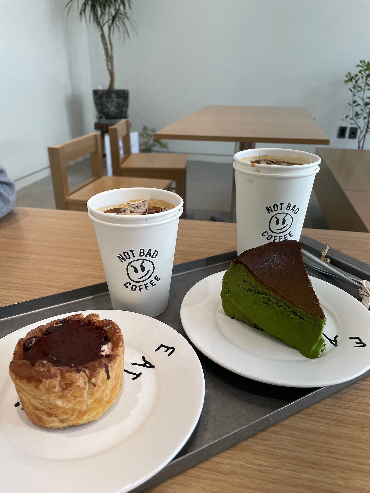 테이블이 놓인 자리로, 서로 마주 볼 수 있도록 앉았다. 1층 내부도 여백이 가득했다. 벽 쪽에는 크고 작은 식물 화분들이 놓여 저마다의 존재감을 뽐내고 있었다. 높은 천장과 통창. 자리에 앉으니 카운터와 중앙 광장이 내다 보였다. 중앙 광장에는 2층에서 봤던 목재 벤치들이 오와 열을 맞춰 놓여 있었다. 시간이 지나자 그곳에도 손님들이 앉기 시작했다. 이제 테라스를 즐길 수 있는 날씨구나.