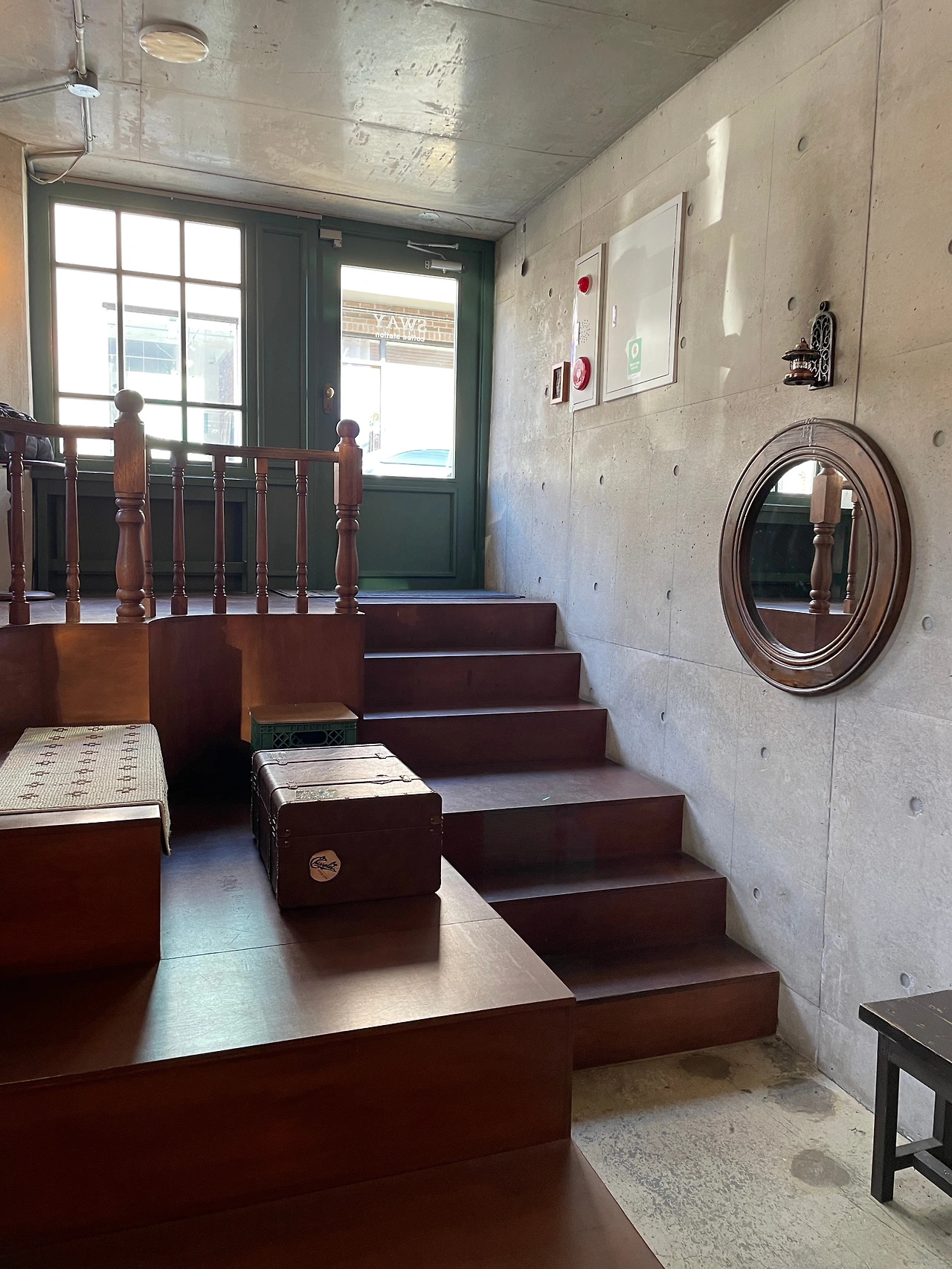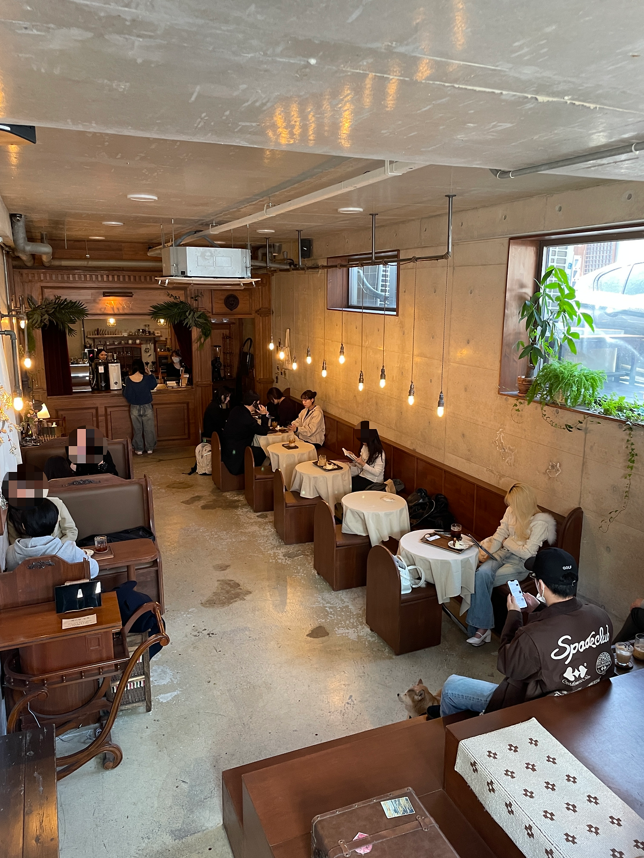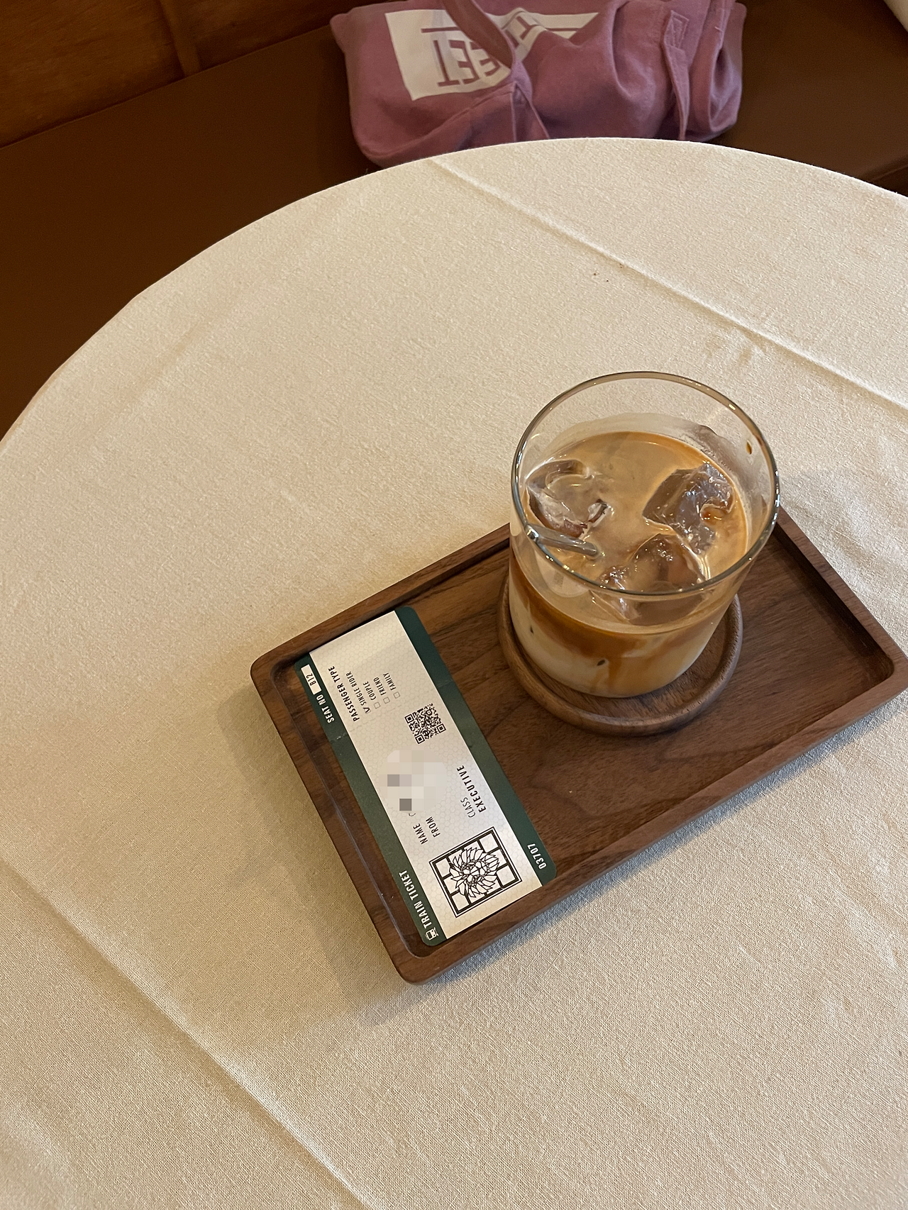 주문을 마치고 화장실을 다녀온 사이, 테이블에 놓인 나무 트레이. 그 위에는 주문한 커피와 기차표가 담겨 있었다. 서빙되는 순간을 직접 맞이하지 못해 살짝 아쉬움도 들었다. 기차 여행의 기분을 조금이라도 더 느낄 수 있었을지도. 다시 주변을 둘러봤다. 혼자 책을 읽거나, 연인 혹은 친구 등 동행과 담소를 나누거나, 계단 쪽 자리에는 반려견을 데려온 손님도 있었다. (그 시바이누가 있어 이 카페가 더 호감으로 남은 것 같다). 스테이션(기차역)의 콘셉트를 가진 곳이었지만, 기차의 객실에 있는 느낌도 들었다.