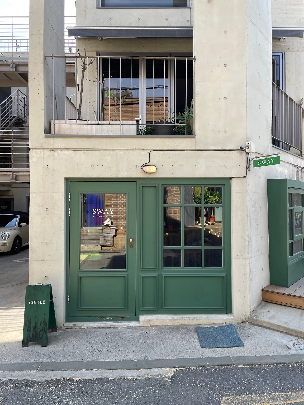 진한 초록색 입간판과 문을 보니 마치 외국에 와있는 듯했다. 안으로 들어가니 외부와는 또 다른 외국 분위기가 났다. 2층에서 내려다보는 듯한 구도로 '스웨이커피스테이션'의 내부가 한눈에 들어왔다. 이런 고급스러운 반지하 공간이라니. 입구에서부터 난 계단을 내려가야 비로소 도착이었다.