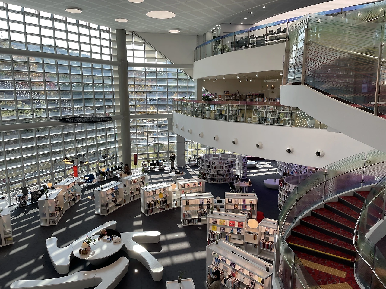 특히 시선을 사로잡은 곳은 2층 제너럴 그라운드였다. 아이러니하게도 책보다는 공간과 가구들이 눈에 띄었다. 도서관이라고 하면 느껴질 딱딱하고 정형화된 가구들이 아닌, 컬러풀한 색상과 독창적인 디자인을 지닌 의자와 책상들이 곳곳에 있었다. 마치 직접 만지고 앉아볼 수 있는 가구 전시회에 온 듯했다. 거의 누워서 있을 수 있는 소파의자(?)도 곳곳에 있었다.
