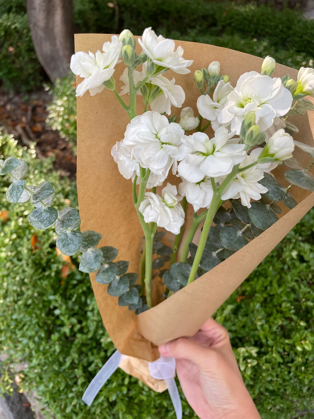 꽃 외에도 다른 소재를 얹어주시며 부지런히 꽃을 포장해주시던 손길. 이동시간을 확인하며 줄기 끝부분에 부어주시던 물의 양도 평소보다 넉넉했으며, 마무리도 평소의 마끈이 아닌 흰색 리본을 꺼내 정성스럽게 묶어주셨다. 검은색 리본이면 더 좋았을 텐데, 지금 있는 색깔이 이것뿐이라고 하시면서. 그 외 장식을 위해 붙여주시던 스티커도 이번에는 붙이지 않으셨다. 그렇게 나는 꽃과 함께 사장님의 마음을 조심스레 받아 들었다. 아무리 작은 매개체와 표현이라도, 진심은 통하는 건가 보다.