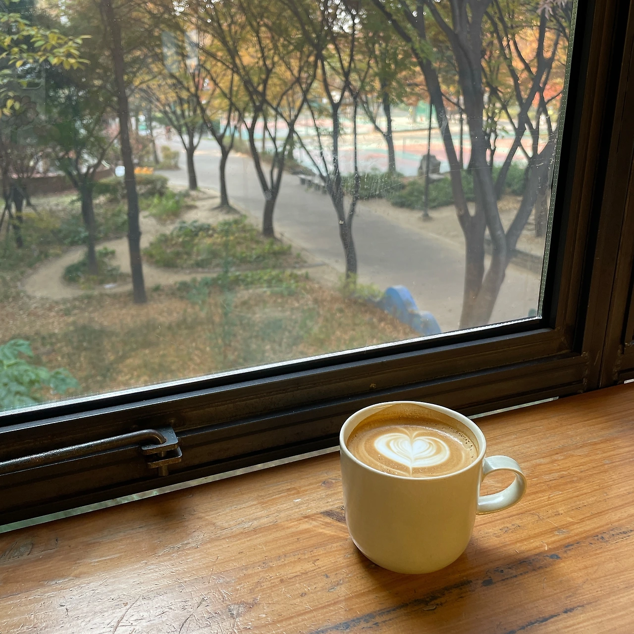 그렇게 외부 계단을 올라가 보니 더 조용한 공간이 펼쳐져 있었다. 제일 맘에 들었던 곳은 바로 창가 자리. 등받이가 없는 스툴형 의자와 카운터 테이블이 있던 곳. 창가에는 서울숲의 가을 나무 풍경이 자리 잡고 있었다. 그렇게 주문한 커피를 받자마자 다시 2층으로 조르르 올라와 창가에 자리를 잡았다. 오픈 시간에 오니 이런 시간을 누릴 수 있구나.