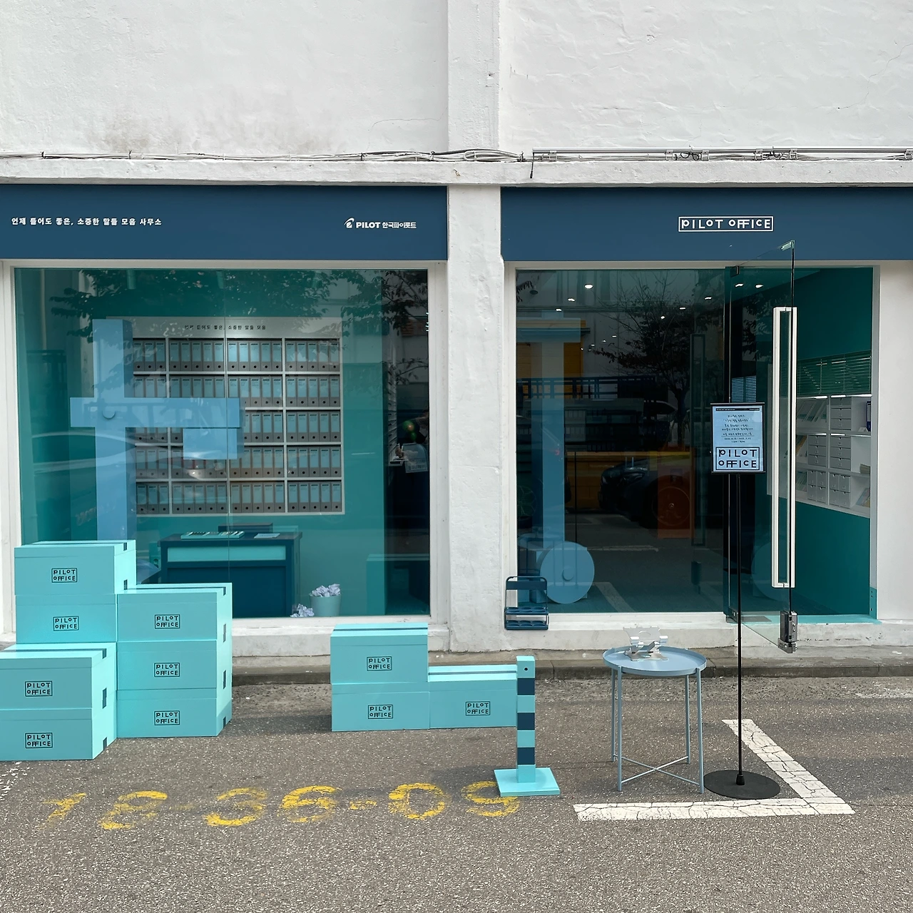 개구리 풍선을 들고 신나게 성수역으로 향하는 길. 그렇게 성수 카페거리에 다 와갈 즈음, 밝은 하늘색 외벽이 보였다. '여긴 또 뭐지!' 자세히 보니 파이롯트 팝업스토어였다. 파이롯트라면 유명 문구 브랜드. 특히 나의 수험생 시절 단짝(?) 필기구였던 하이텍씨의 고향 아니던가. 그렇게 나의 두 번째 일탈이 시작되었다.