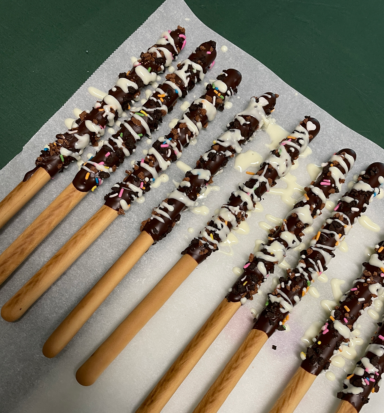 그런데 생각보다 초콜릿이 금방 굳지 않았고, 그 양도 가늠할 수 없어 어느 정도 굳기까지 멍하니 기다려야 했다. 적당히 입혀진 초콜릿이 굳기 전에 빠르게 각종 크런치와 스프레드를 손으로 솔솔 뿌려주었다. 그리고 바닥에 칼집을 낸 종이컵을 뒤집어, 그 틈에 빼빼로를 꽂아 세워놓았다. 그렇게 조금 기다리면 완성이었다.