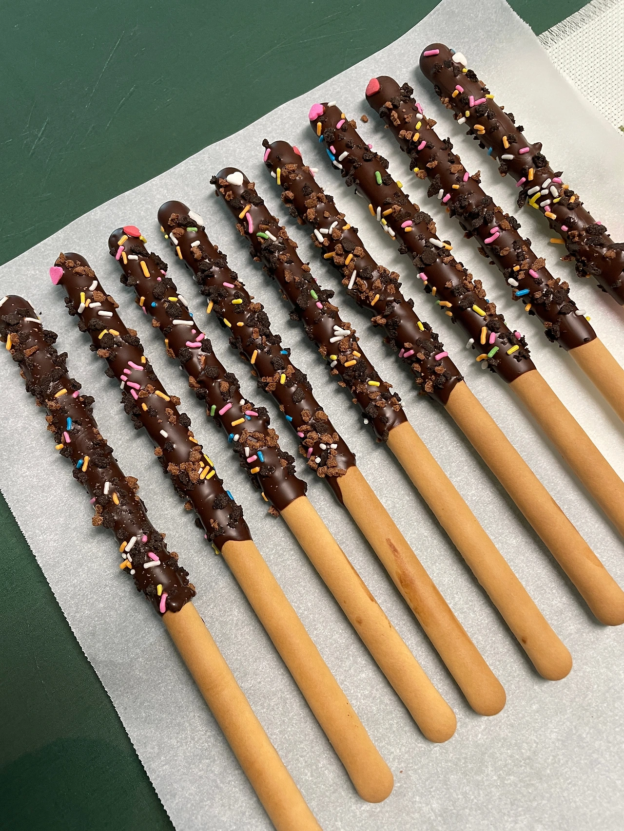 식탁 위에 재료와 도구들을 펼쳤다. 초콜릿 코인을 담은 짤주머니를 긴 원통형 컵에 담은 다음, 그 컵에 따뜻한 물을 부어 초콜릿을 중탕으로 녹여주었다. 그리고 그 안에 스틱과자를 담갔다 빼며 초콜릿을 입혀주었다. (예전에 맥도날드에서 알바를 하며 초코콘을 만들었던 때가 떠올랐다.)