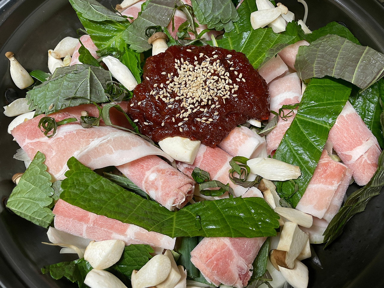 우선 콩나물을 씻어 넓은 냄비에 깔아준다. 그리고 5mm 두께로 채 썬 양파, 3cm 정도 길이로 자른 대파를 골고루 콩나물 위에 깔아준다. 익어서 부드러워질 식감을 고려하여 조금 두꺼운 감으로 써는 것 같다. 이어서 불고기감으로 정한 고기(나는 대패삼겹살로 했지만, 돼지 뒷다리살이 보통인듯했다)와 깻잎을 올린다. 여기서 깻잎은 5장 정도는 한입 크기로, 1장은 돌돌 말아 얇게 채 썬 것이다. 냉장고에 남아있던 미니 새송이버섯도 꺼내어 적당한 식감을 남길 정도로 자른 다음 함께 넣어주었다. 마지막으로 양념장을 올리고 중불을 켰다.