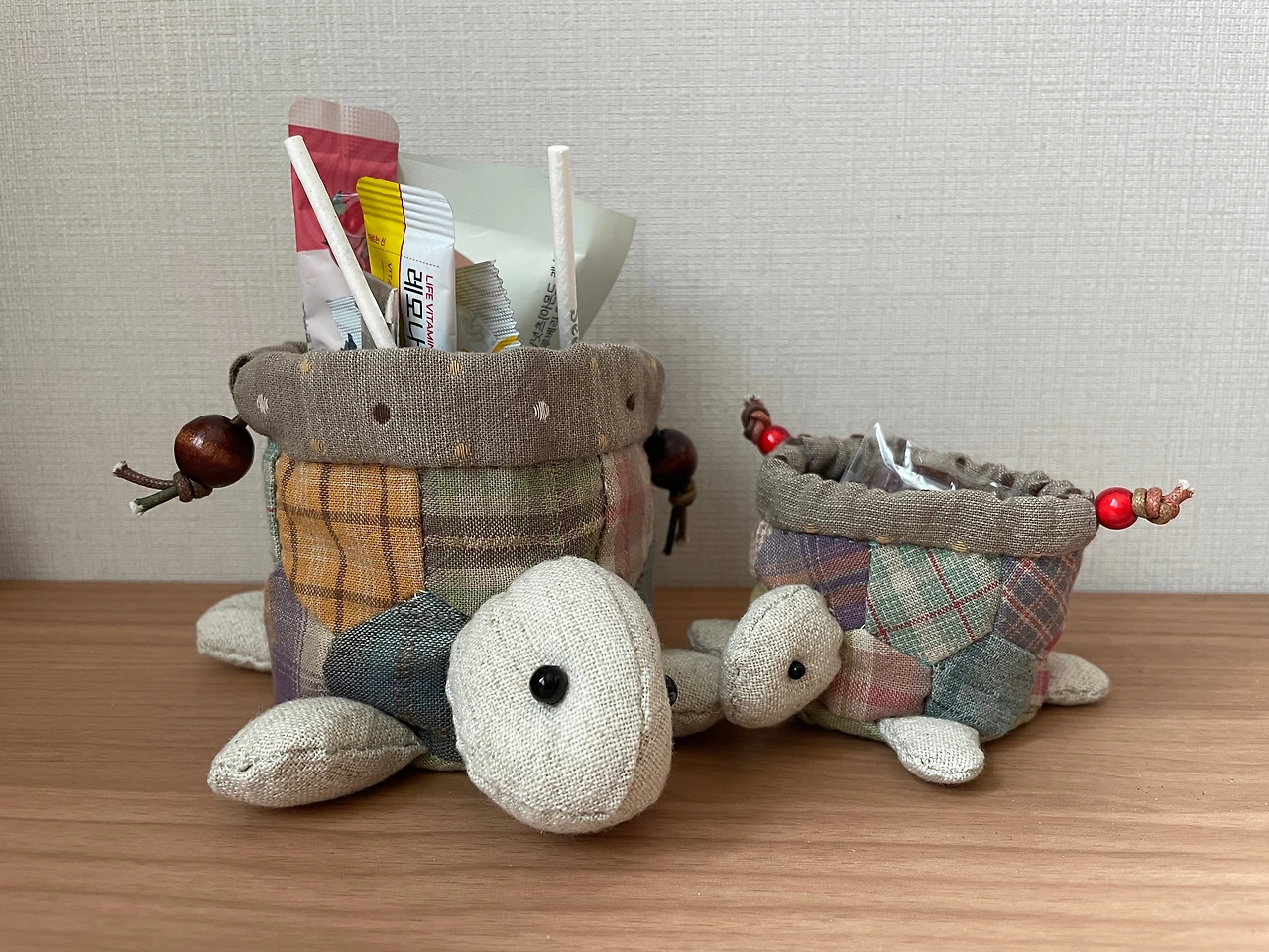 그다음, 드디어 이 친구들을 데려왔다. 바로 거북이 인형 주머니다. 퀼트를 배우시는 엄마가 만들어주신 것이다. 엄마와 함께 퀼트 선생님 작업실에 놀러 갔다가 견본을 보고 귀엽다고 했더니, 엄마의 다음 퀼트 수업 도안은 이 거북이가 되었다.