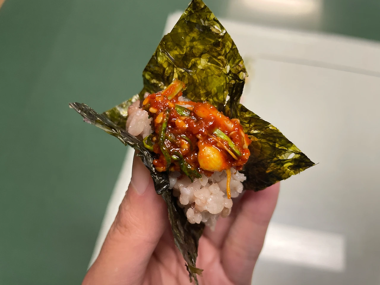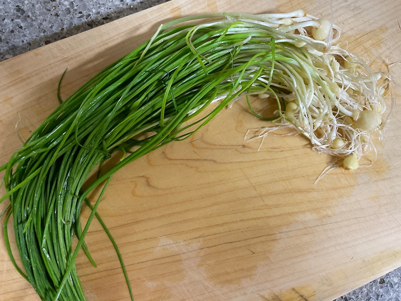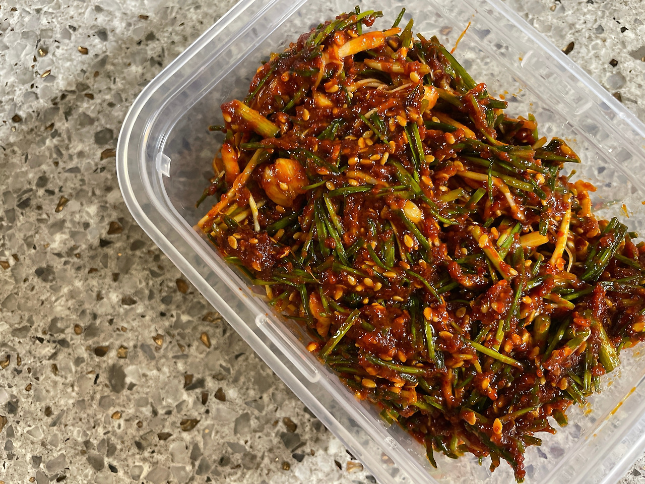 먼저 달래를 손질해야 했는데, 생각보다 시간이 오래 걸렸다. 당황의 연속. 가는 초록 줄기 끝 동그랗게 달린 흰 알뿌리들. 묻어 있는 흙을 털고 무른 껍질들을 벗기다 보니 어느새 잡생각이 싹 사라졌다. 나중에는 내 멋대로 손만 움직이는 느낌마저 들었다. 시간이 지날수록 속도가 나긴 했지만, 달래와 물아일체가 된 듯한 그 감각만큼은 뭔가 신비롭기까지 했다. 손끝에 은은하게 남은 달래향. 이건 나만 느낄 수 있는 향이었다.