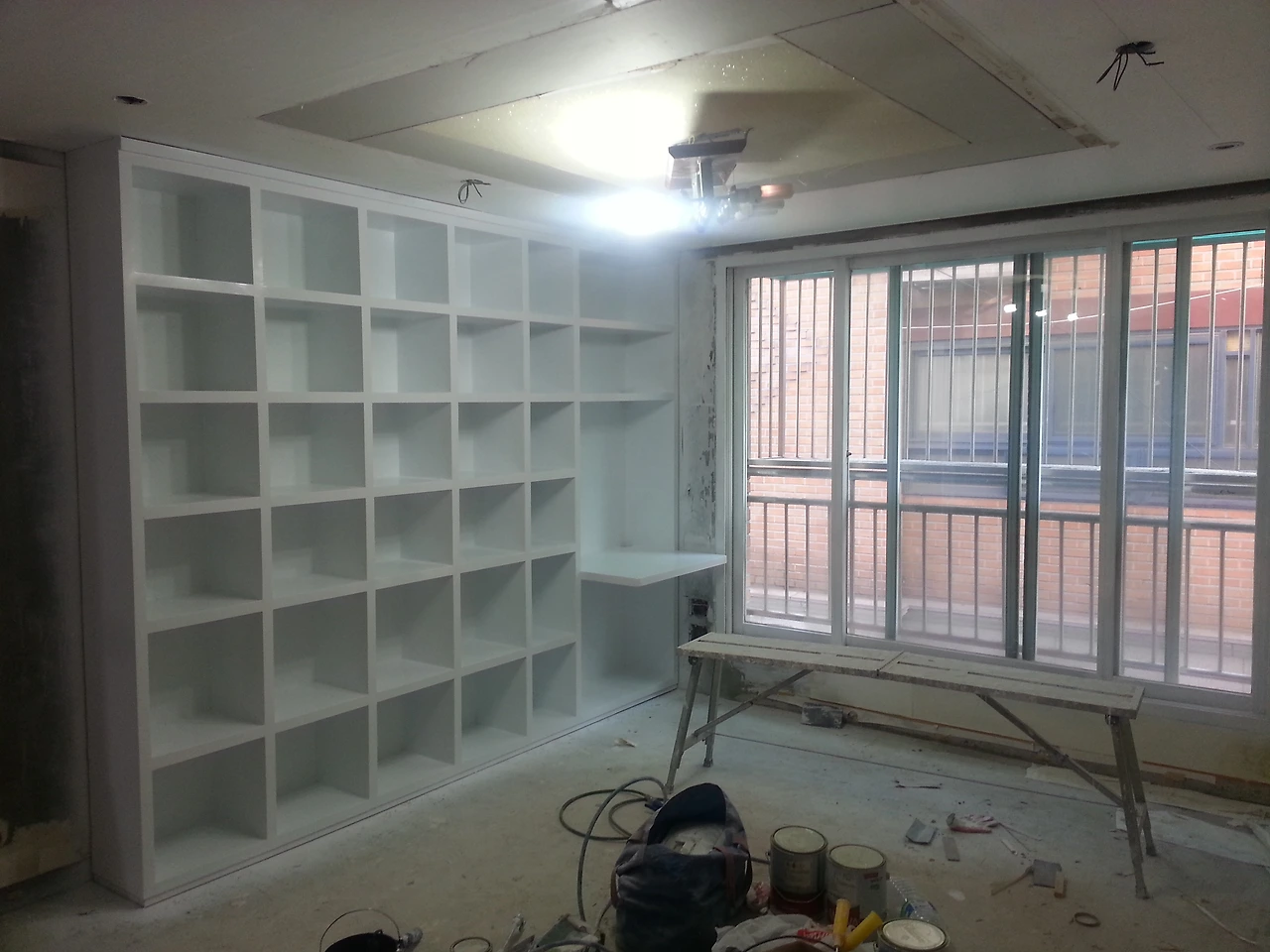 페인팅 시공은 페인트 색상을 잘 유착 시키기 위해 칠하고 건조하기를 3회 정도 반복해야 하는 인내력이 필요한 작업이다. 창틀은 모두 빼 내서 유리창 부분을 마스킹 처리 후 붓으로 페인팅 했고 거실에 위치한 다용도 붙박이 책장은 붓질 대신 페인트를 고압 분사하는 방식으로 칠했다. 모든 창틀이 화이트면 좀 심심해서 베란다 창틀은 블랙으로 칠하고 망입유리를 넣어 포인트를 주었다. 집 중앙에 위치한 방화문은 단순 출입문이 아니라 게시판처럼 활용하고 싶어 블랙 색상의 칠판 페인트로 칠했다.