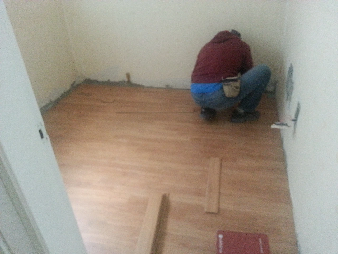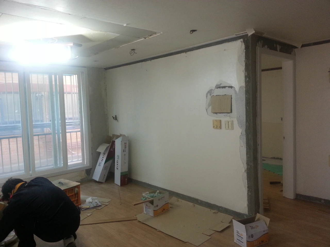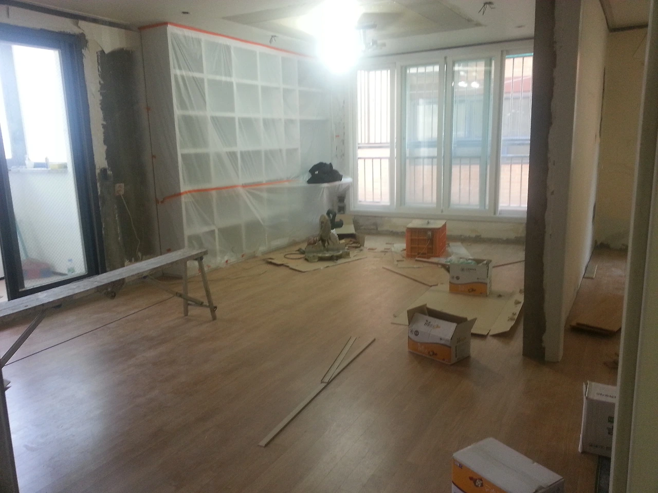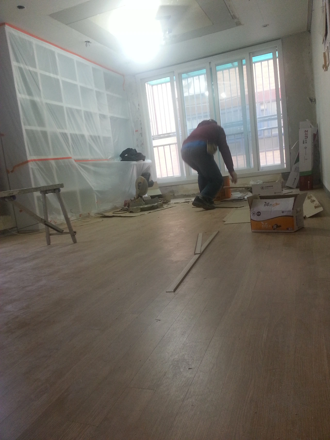 강화마루는 바닥에 본드를 바르고 그 위에 패널을 놓고 고무 해머로 두들기며 붙이는 방식으로 시공을 한다. 이 말은 강화마루 시공 전 바닥을 깨끗하게 청소를 해야 한다는 얘기다. 그래야 마루 패널이 뜨지 않고 콘크리트 바닥과 잘 흡착될 수 있기 때문이다. 문제는 목공 작업 및 전기 공사에서 나온 미세한 톱밥, 나무 피스, 시멘트 및 콘크리트 가루 등이 바닥에 가득하다는 현실이었다. 뭐 어쩌겠나! 이럴 때 가장 효과적이고 효율적인 방법은 정신적 데미지가 더 커지기 전에 빠르게 쓸어 담는 것이다. 둥둥과 나는 철물점에서 사 온 가느다란 솔로 세심히 바닥의 가루와 리모델링 잔해들을 쓸어 담기 시작했다. 이 때 처음이자 마지막으로 우리 집이 15평인걸 감사했다.