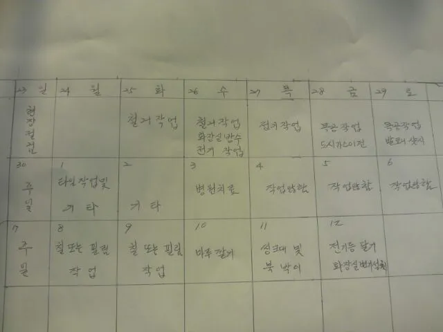 어쩔 수 없이 웬만하여서는 사용하지 않으리라 마음먹었던 카드를 꺼낼 수밖에 없었다. 휴대폰으로 한 통의 전화를 걸었다. 수화기 저 편에서 퉁명스러운 목소리가 들려오고 짧은 통화를 했다. 며칠 뒤 40년 경력을 자랑하는 베테랑 목수께서 직접 자를 대고 그린, 시공 일정표 한 개가 문자로 배달됐다.
