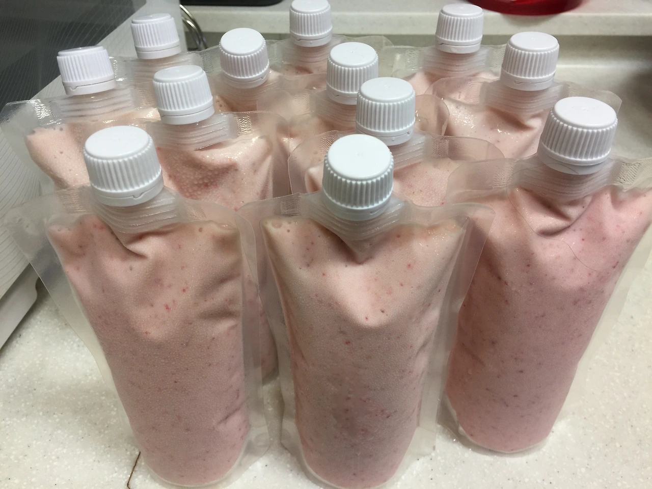 어느 여름날 한번은 토요일 아내가 데이근무라 새벽에 나갔다. 며칠 전부터 아내 병원 동료들을 위해 먹을 것을 준비해주기로 했다. 생각 끝에 딸바라떼로 정했다. 딸기와 바나나, 우유를 갈아 만든 음료다. 문제는 포장이다. 수소문해서 네이버에 검색해 투명 파우치(200ml)를 100장 구입했다. 전날 퇴근 후 부지런히 만들어 냉동실에 넣어 뒀다 당일 배달해줬다.