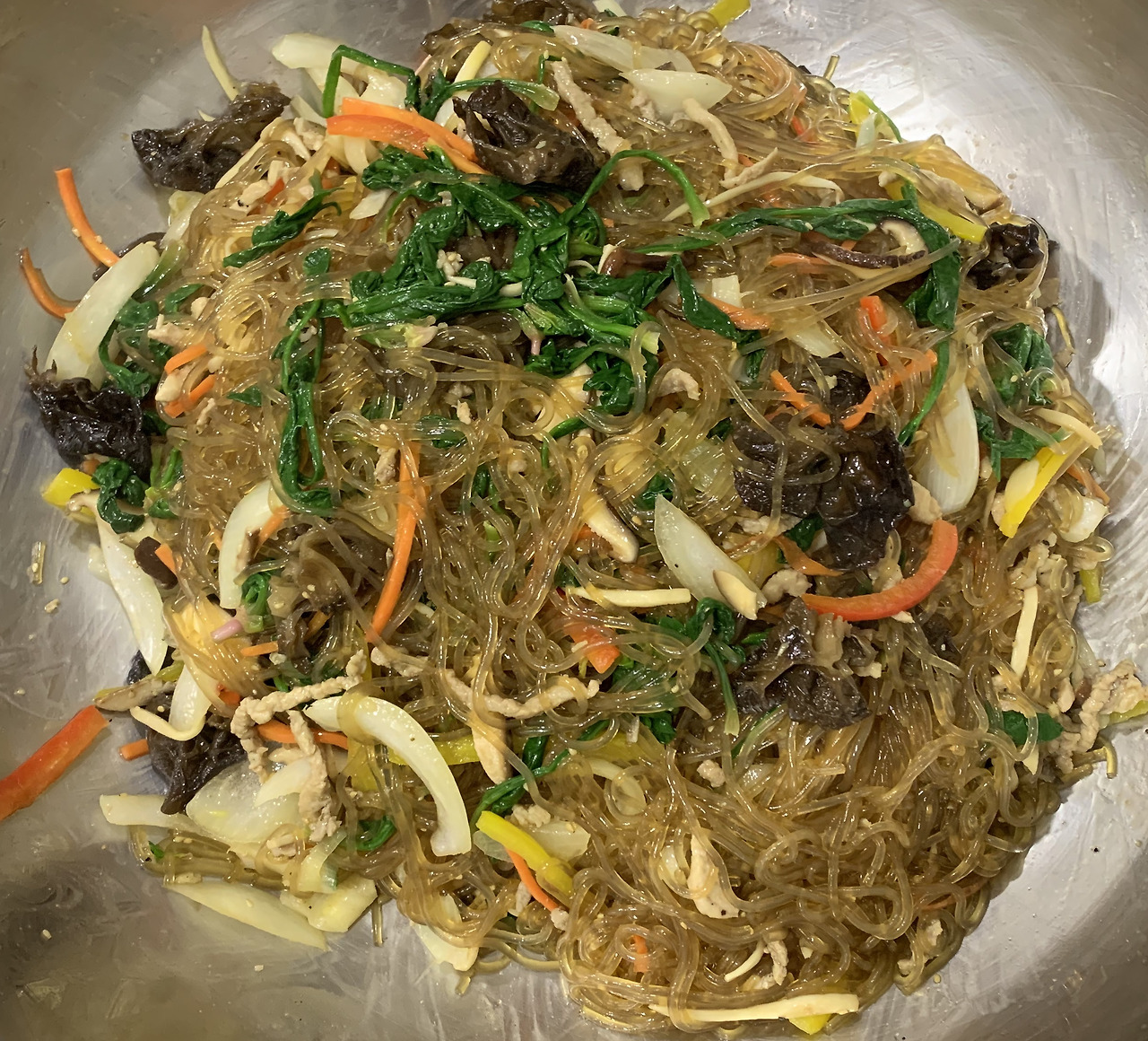 잡채 요리에서 가장 중요한 당면 삶기는 내 몫이다. 당면은 간, 색깔, 식감을 한 번에 잡는 게 중요하다. 당면 500g 기준으로 물 1L, 다시마간장 140ml, 설탕 30g을 사용한다. 그러면 당면 삶기가 한 번에 가능하다. 센 불에서 해야 하고 삶을 때 뚜껑을 닫지 않는다. 국물이 거의 졸았을 때 약불에서 식용유를 넣고 재빨리 볶아주면 된다.