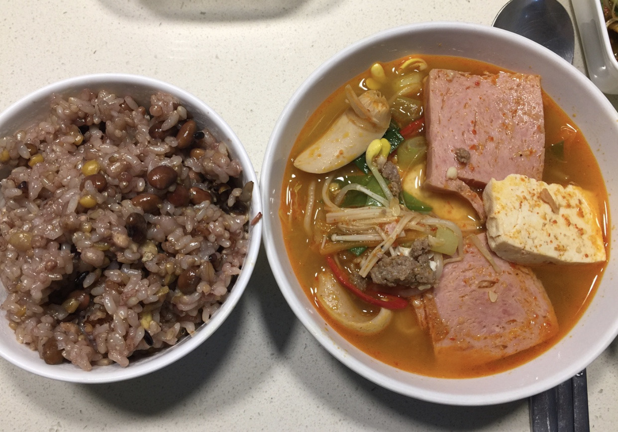 찌개에 육수는 기본이다. 육수는 다시마도 좋고 멸치도 훌륭하다. 애호박과 당근, 양파, 느타리버섯으로 국물 맛을 더한다. 여기에 콩나물 한 줌, 김치(김칫국물)와 돼지고기 다짐육으로 국물을 배가한다. 단백질 보충용으로 두부를 올리고 대파, 청양고추로 완성한다. 라면은 데쳐 기름기를 빼고 사리로 이용한다. 떡까지 넣으면 금상첨화.
