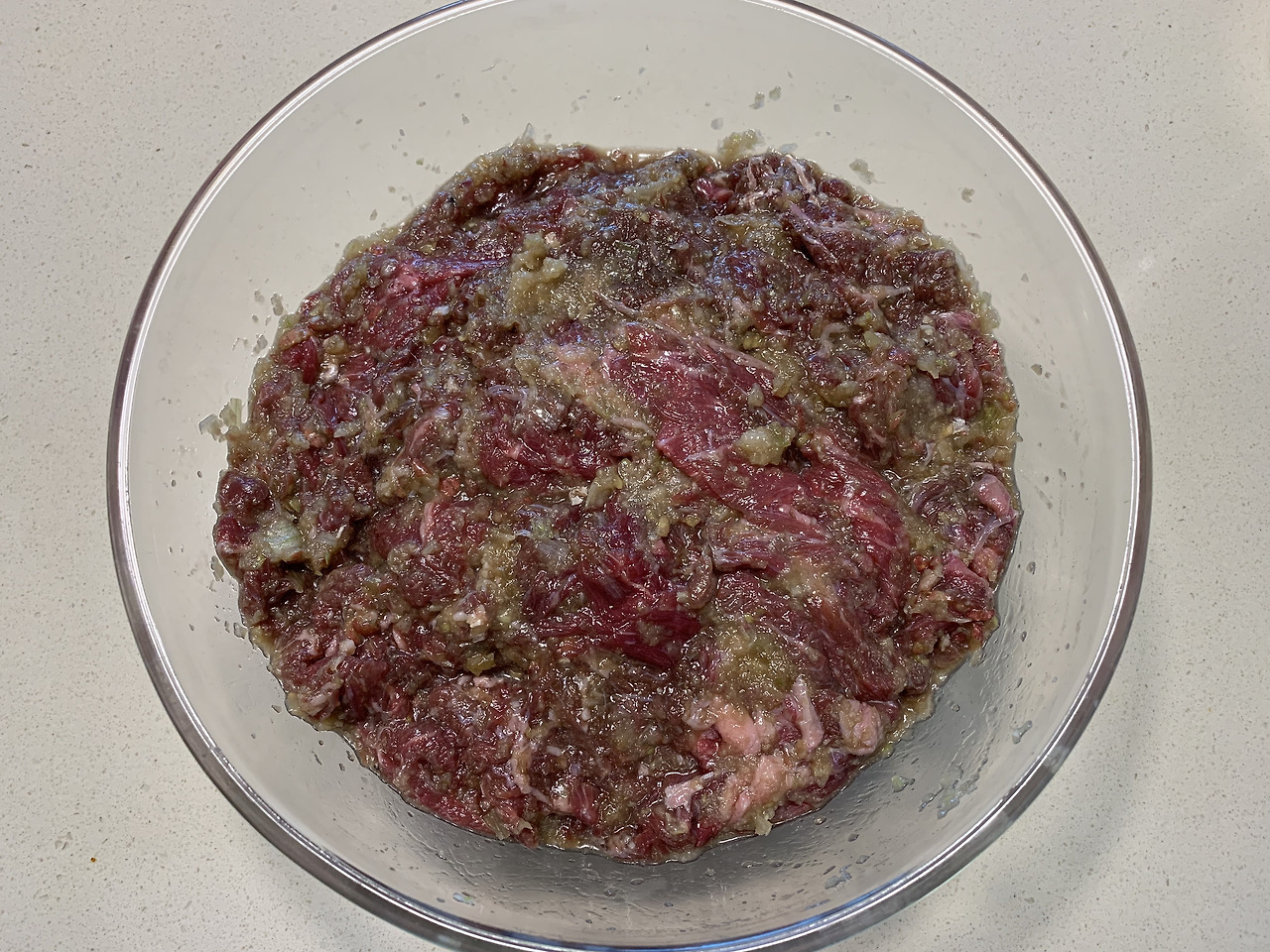 소고기를 먼저 1차 밑간 한다. 다진마늘, 국간장, 맛술, 후추, 참기름을 쓴다. 다음에 2차 밑간을 한다. 사과, 배, 양파를 적정량 갈아 넣는다. 다시마물도 준비한다. 당면도 불려놓는다. 30분 이상 밑간 하는 시간에 당근, 표고버섯과 대파, 청양고추, 홍고추도 채 썰어 준비한다.