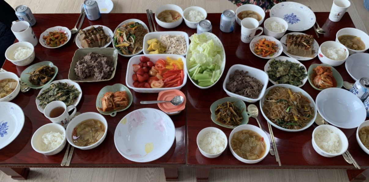 백미밥(생협/유기농), 배추된장국, 잘 익은 김장김치와 갓김치, 한우로 만드는 잡채와 소불고기, 닭가슴살 샐러드와 수제통깨소스, 견과류멸치볶음, 부추전, 수제 도토리묵, 치즈계란말이(시그니처메뉴), 오이도라지초무침, 과일, 홈메이드 원두커피로 정했다.