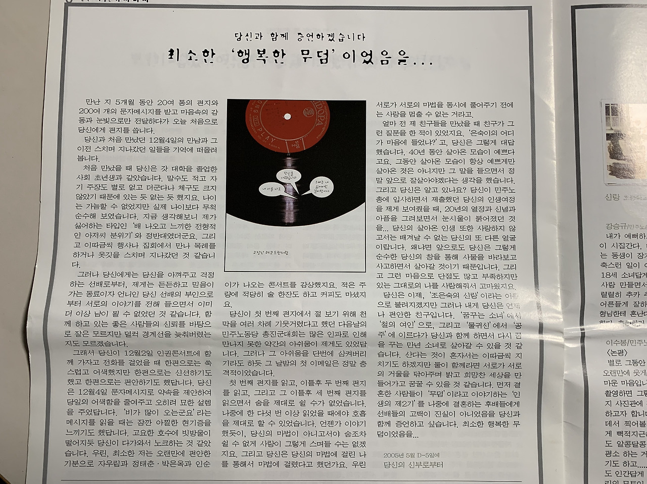 결혼 신문은 인연의 증빙자료다. 그 어떤 서약보다 강력하다. 흔들리는 초심을 되돌아볼 수 있는 거울이다. 볼 때마다 웃음도 난다. 당시의 심리가 지금과 달라진 이유 때문이다. 그래도 한때 그런 마음을 가졌음이 여전히 뿌듯하다. 인연의 역사는 그렇게 기록됐고 지금의 나를 지탱하고 있다.