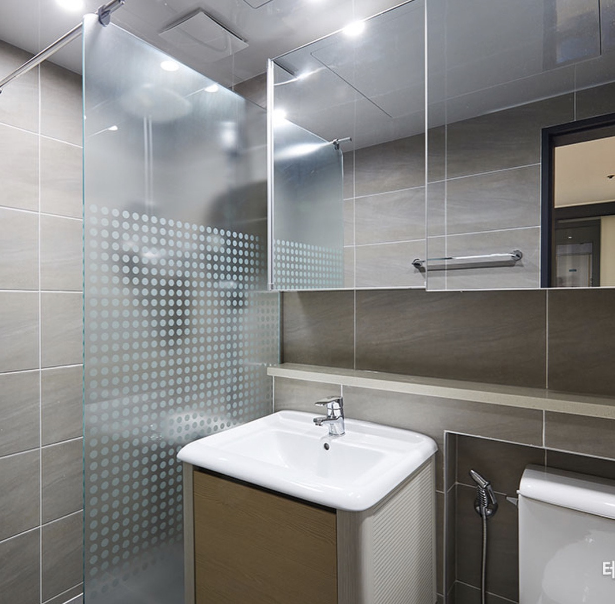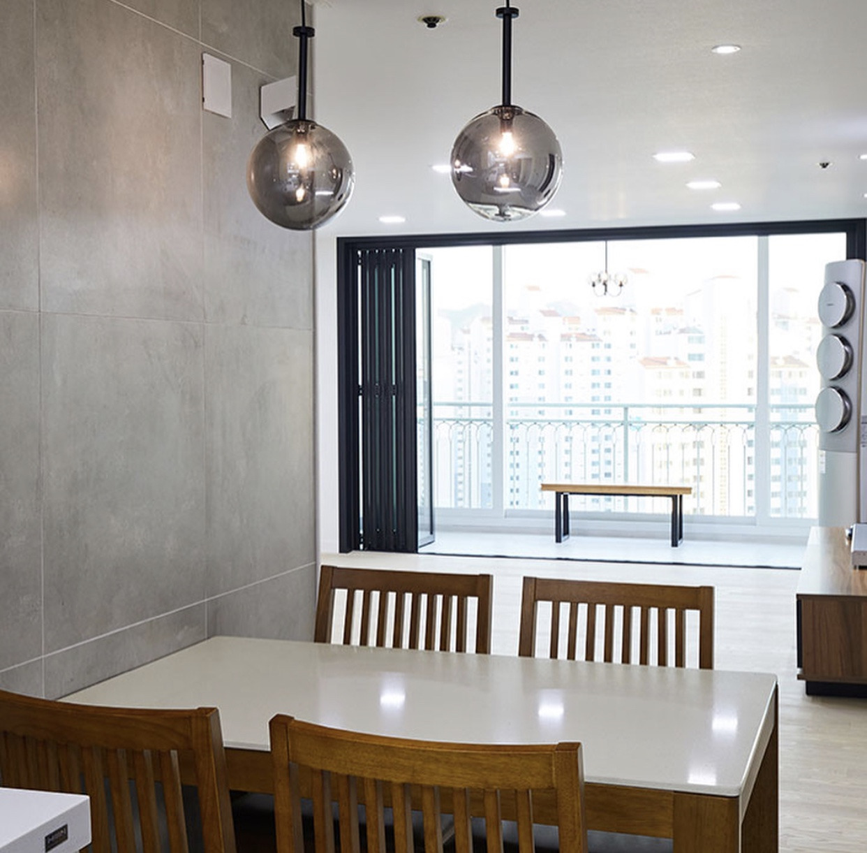 거실 화장실에는 욕조를 없애고 샤워부스로 바꿨다. 아이가 없어서 욕조가 필요 없기도 했고, 장인, 장모님이 주로 쓰시기 때문에 낙상, 미끄러짐 등 안전에도 보탬이 됐다. 무엇보다 주방과 거실, 베란다가 일자로 탁 트여 전망이 훨씬 좋아졌다. 22층 최고층이다 보니 멋진 스카이라운지가 만들어졌다.