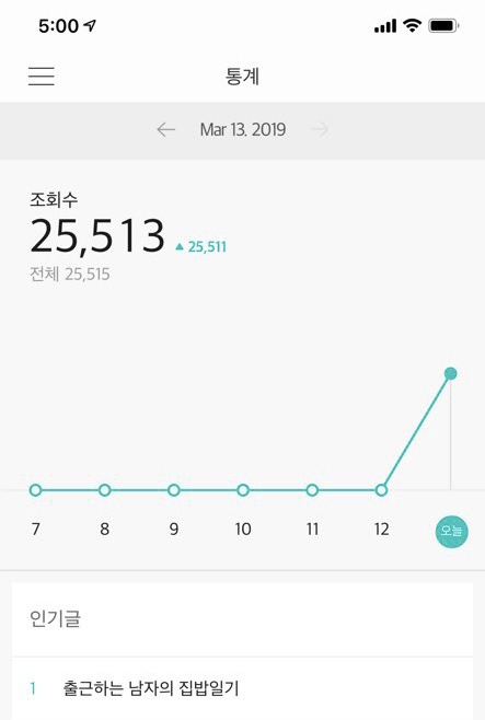 3월 12일 밤 첫 글 ‘출근하는 남자의 집밥일기​’​​​​를 올렸다. 내려고 했던 책의 프롤로그였다. 깜짝 놀랐다. 폭발적인 반응이었다. 1천, 2천, 5천, 1만•••3만, 5만 조회수가 하루 동안 계속 올라갔다. 태어나서 처음 겪는 일이었다. 누가 보는지, 어떻게 이런 일이 일어나는지 찾을 수가 없었다. 브런치 메인에 걸려있기는 했지만 믿기지 않았다. 이틀 사이에 8만 뷰를 훌쩍 넘었다. 출발은 그렇게 시작됐다.