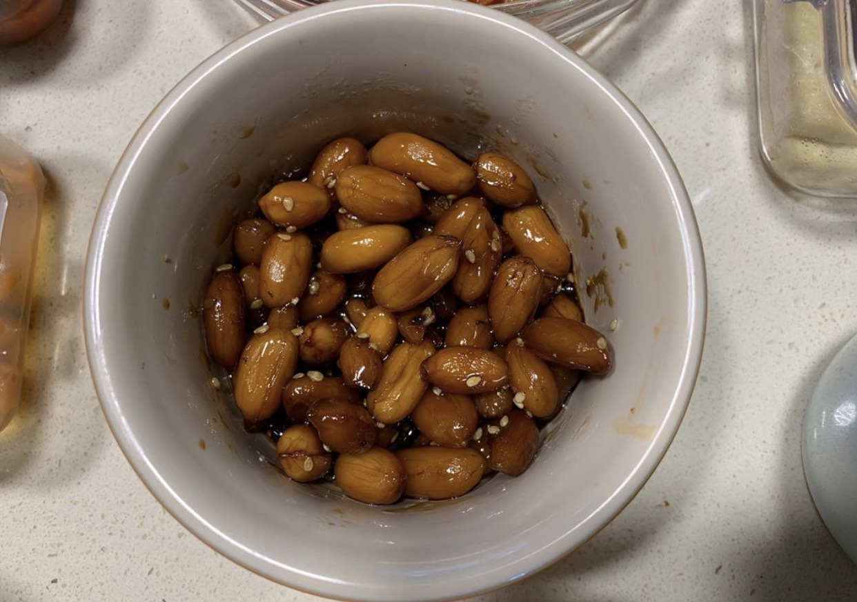 밑반찬 중에 땅콩조림 만한 것도 없다. 보통 (생)땅콩은 볶아서 그냥 간식으로 먹거나 맥주 안주로 많이 사용한다. 의사들은 땅콩을 하루에 20~30알 정도 먹기를 권장한다. 밑반찬 활용은 그래서 필요하다. 문제는 딱딱한 땅콩에 간을 배게 하는 일. 그래야 밑반찬이 되기 때문. 졸일 때 인내심이 필요한 이유다. 대개 간장과 요리당(올리고당)을 넣고 졸이게 되는데, 그전에 꼭 끓는 식초 물에 2-3분 삶아줘야 한다. 비린내와 경도를 잡는데 필수 코스다. 다시마 몇 조각 넣어 우린 다시마육수는 에티켓이다.