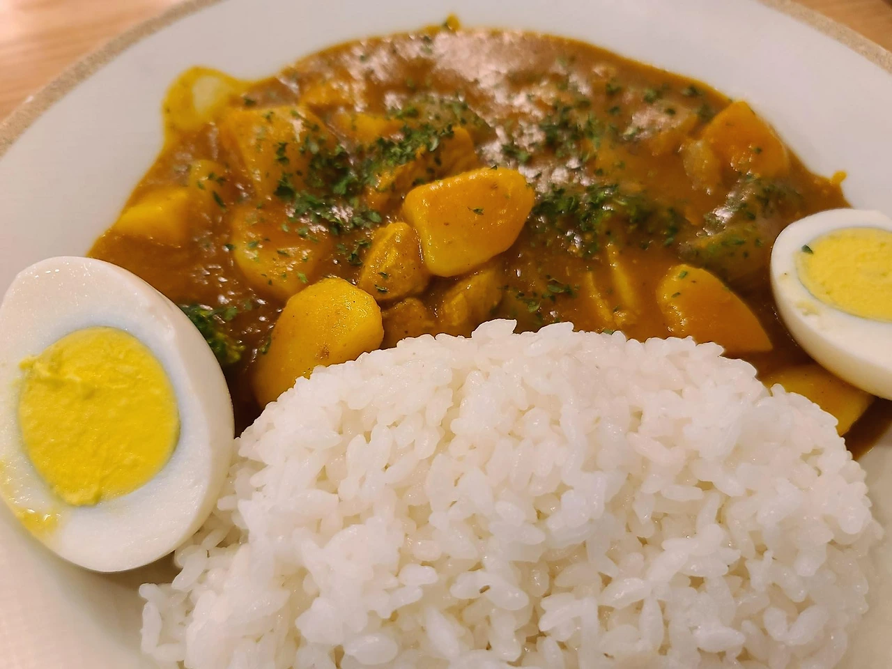 이 분식점의 카레에는 감자, 돼지고기, 브로콜리가 들어가 있으며 그 위에 파슬리 가루가 뿌려지고, 특이하게도 삶은 계란이 반으로 잘려서 양 옆으로 놓여진다. 그리고 사진상으로는 잘 보이지 않지만 밥을 일본식 오므라이스 모양으로 이쁘게 담아주신다.