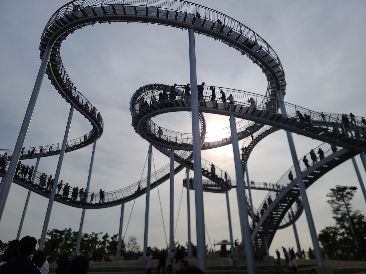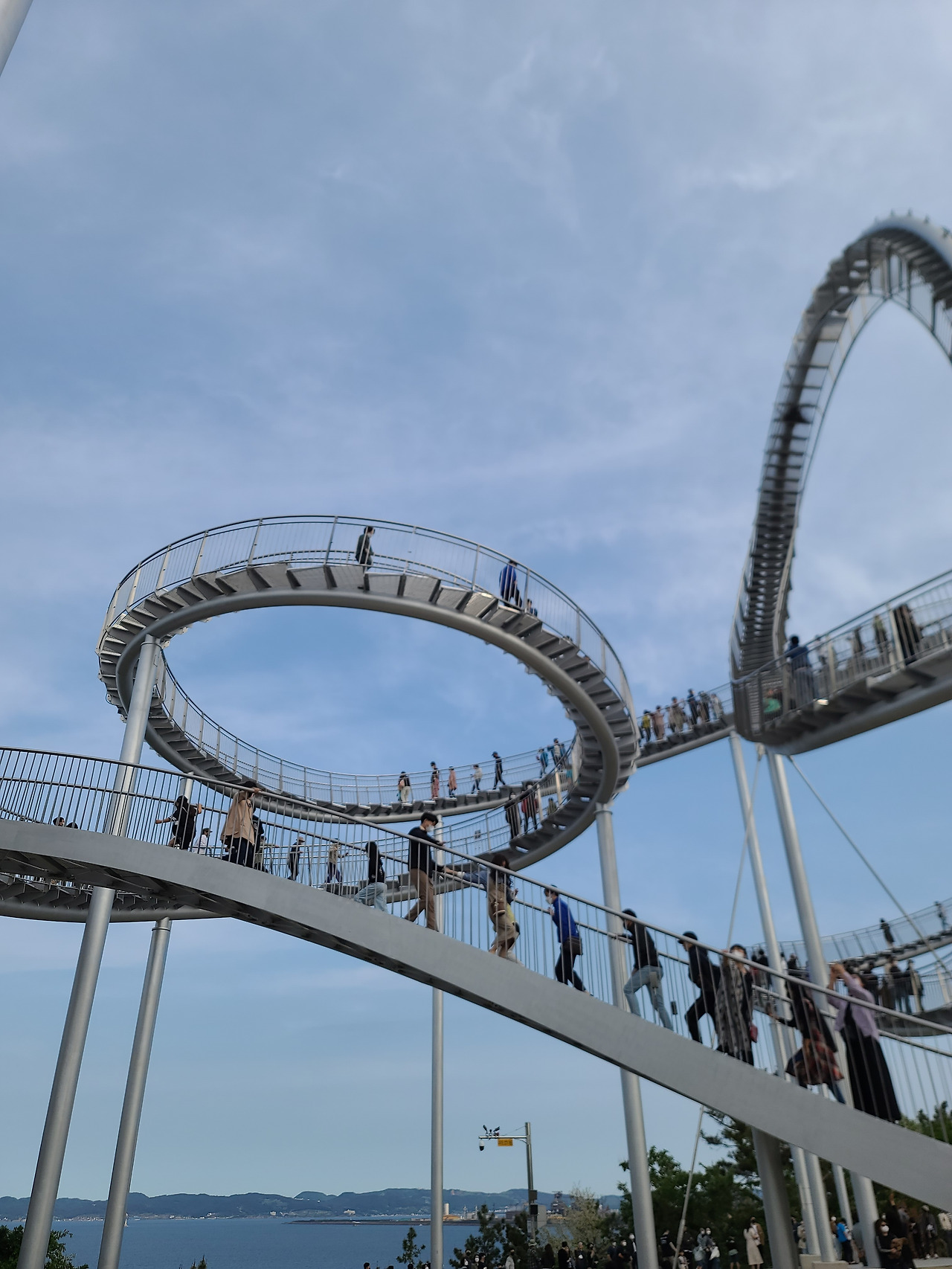 포항시립미술관 주차장에 차를 세우고 약 10분 정도 언덕을 걸어올라가면 갑자기 엄청난 구조물이 딱 보인다. 구조물을 이루고 있는 계단엔 사람들이 걷거나 서서 풍경을 바라보거나 사진을 찍고 있었고, 주변 사람들은 그 광경을 정신없이 쳐다보며 사진을 찍고 즐겁게 잡담을 했다.
