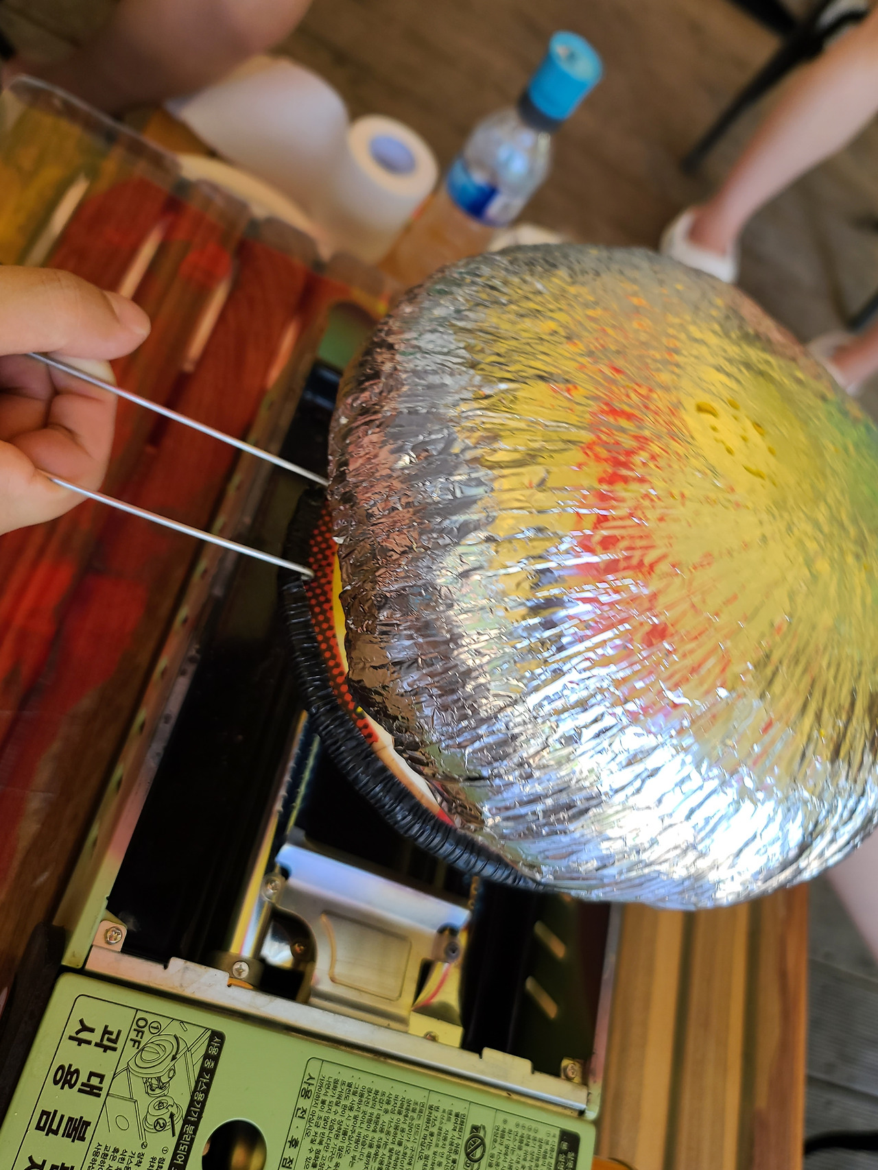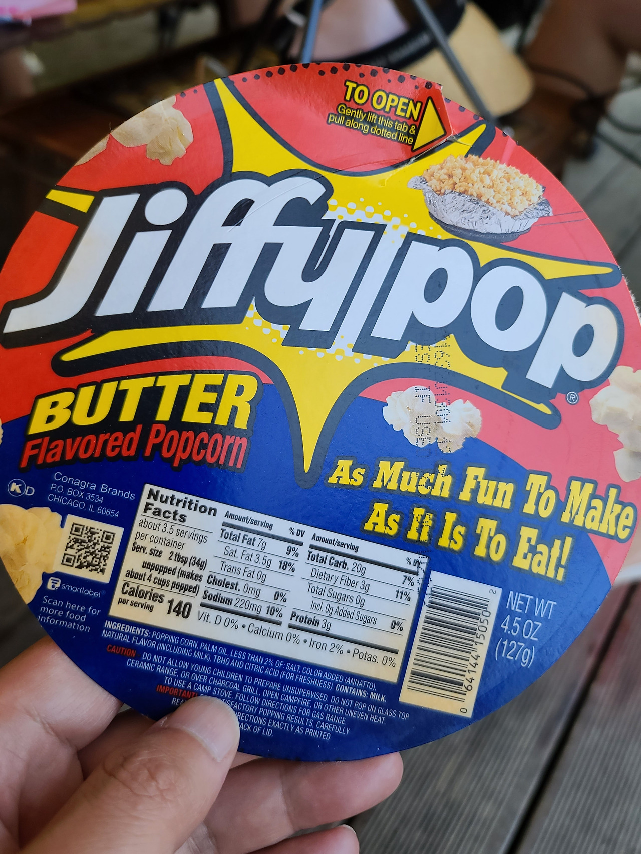 <Jiffy pop 팝콘. 프라이팬 없이 가스버너 위에서 가열하면 납작했던 은박지 부분이 부풀고, 다 튀겨지면 찢어서 먹으면 됨>