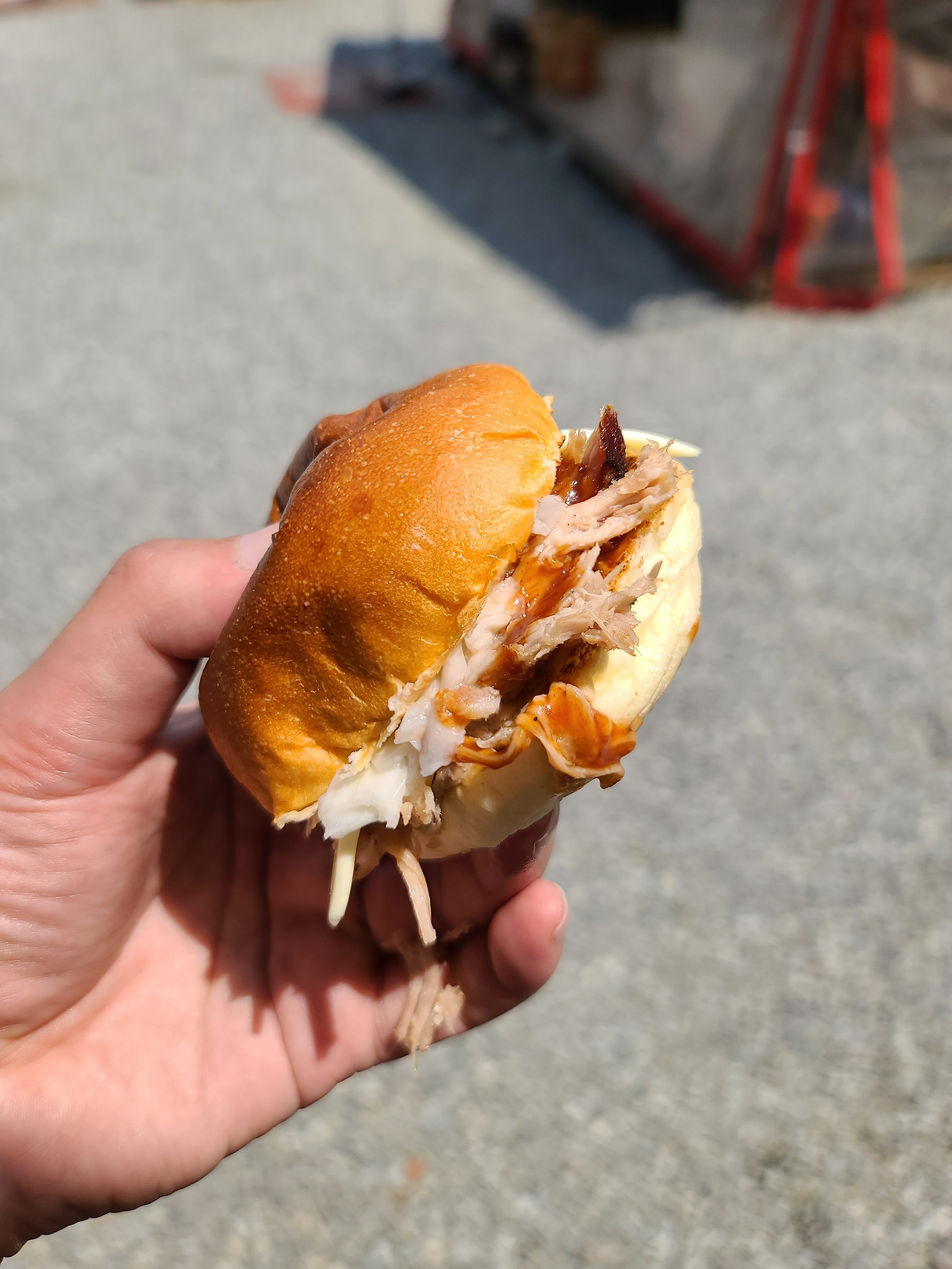 <24시간 수비드한 풀드포크 + 바베큐소스 + 치즈 + 딸기쨈 + 마요네즈 + 코울슬로로 만든 버거, 그리고 군만두>