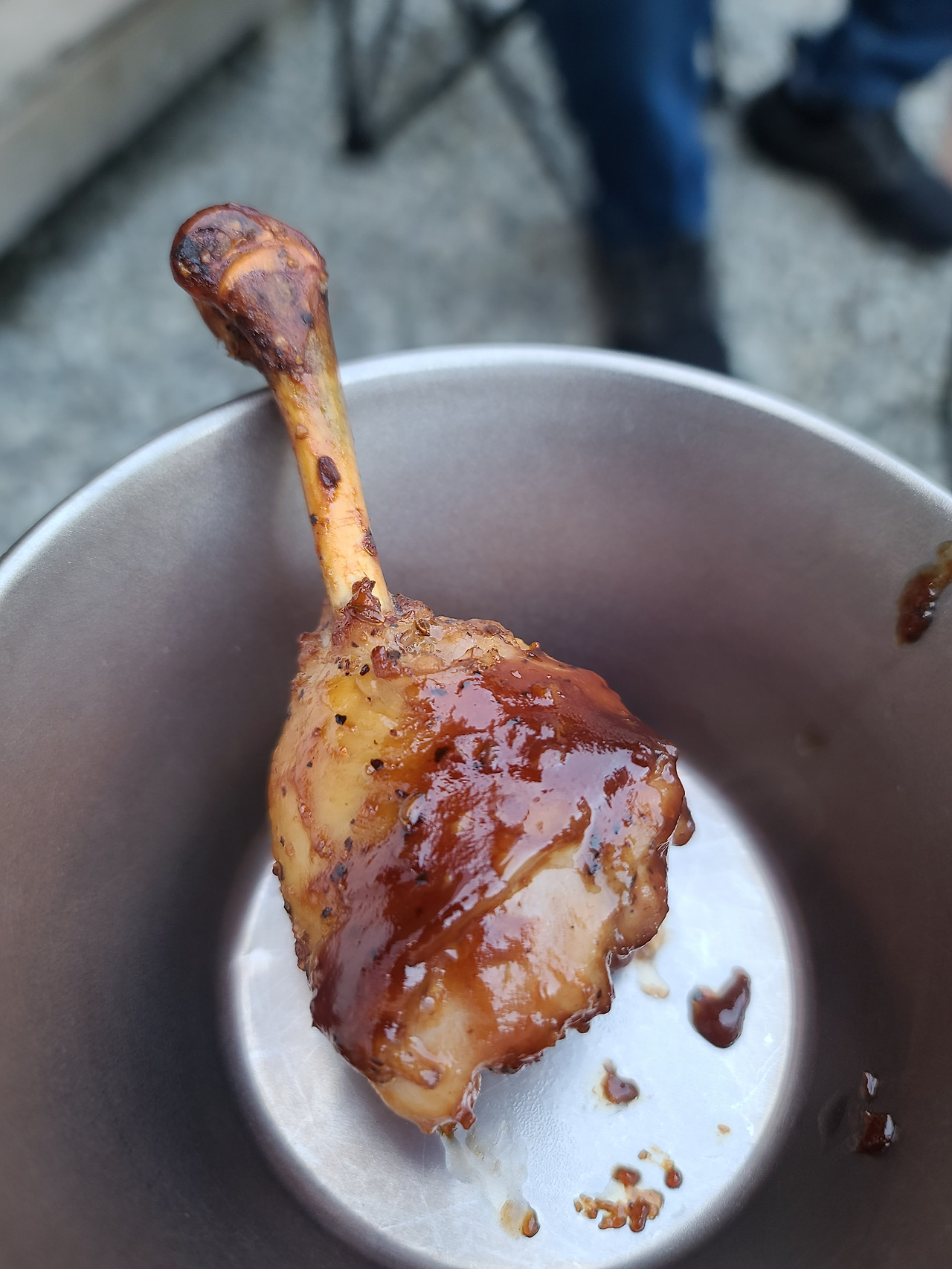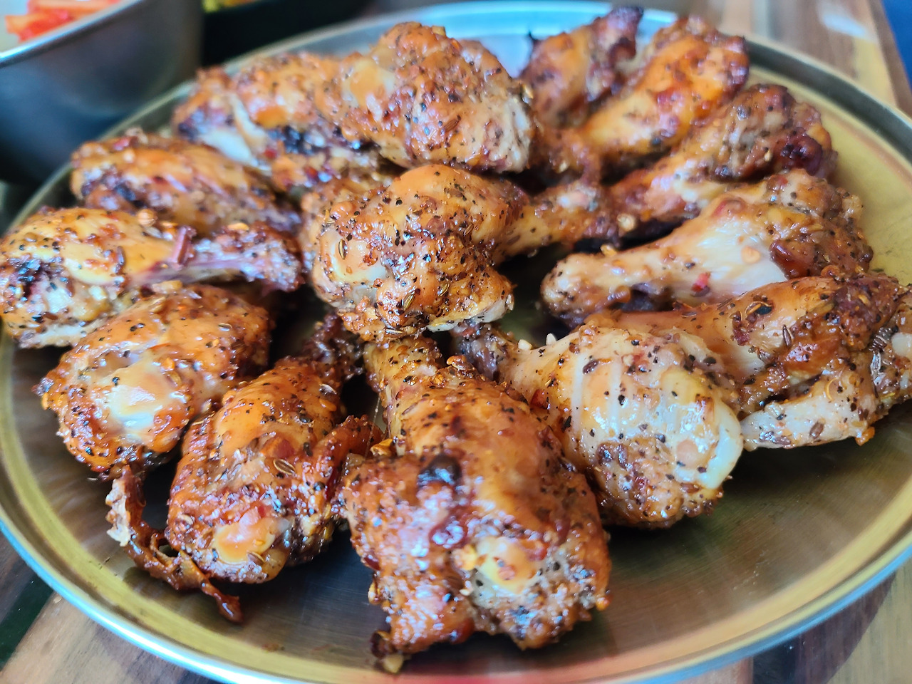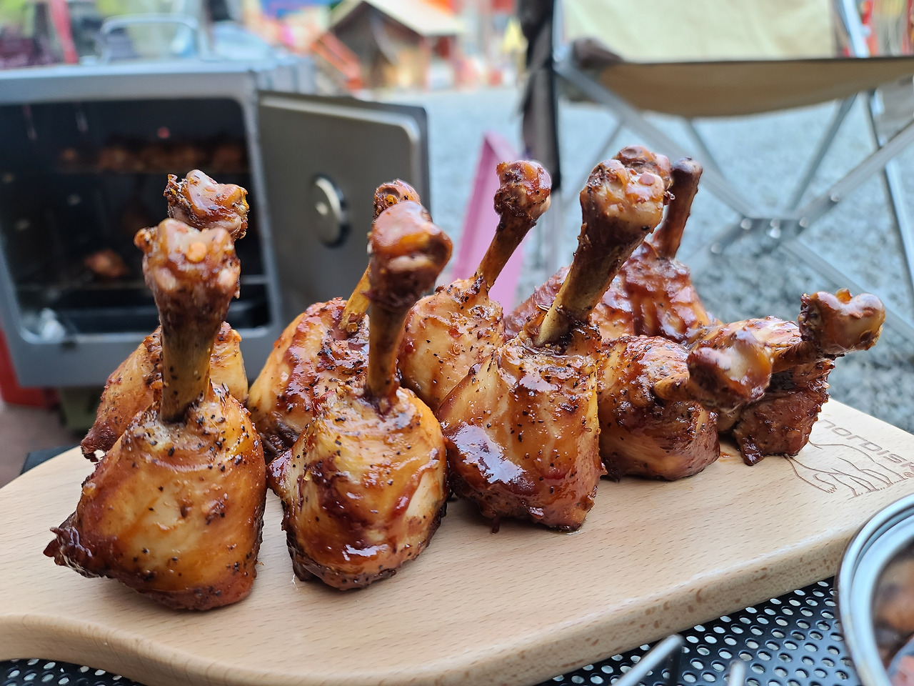 <바베큐 소스를 발라 캠핑용 오븐에서 익혀낸 만화고기(드럼스틱을 만화에 나오는 고기 이미지처럼 정육한 것)와 치킨윙>