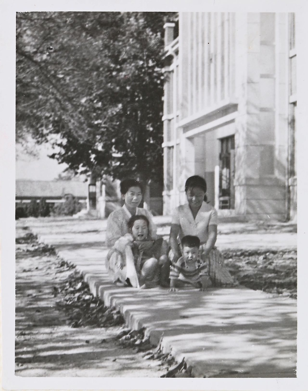 봉선 새엄마와 순미, 매자 이모와 길언, 광주동중학교 교정, 1961.