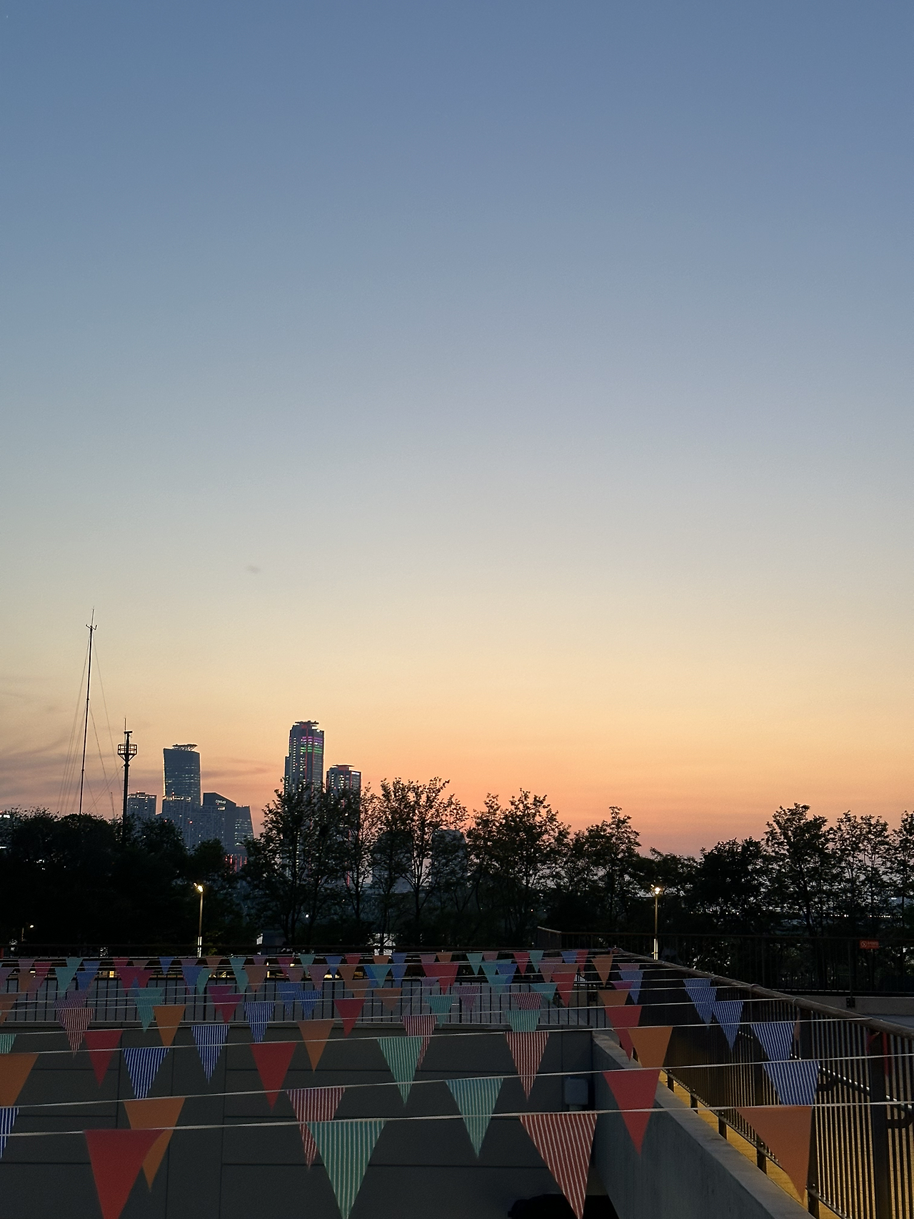 한 바퀴를 다 돌고 나니 아까까지 파랗던 강물이 어느새 어두워졌다. 야외무대를 지나 올라가는 길목에서 사람들이 모두 한 방향을 바라보며 사진을 찍고 있었다. 그 방향에는 붉게 물든 노을이 펼쳐져 있었다. 나도 그 순간을 담았다.